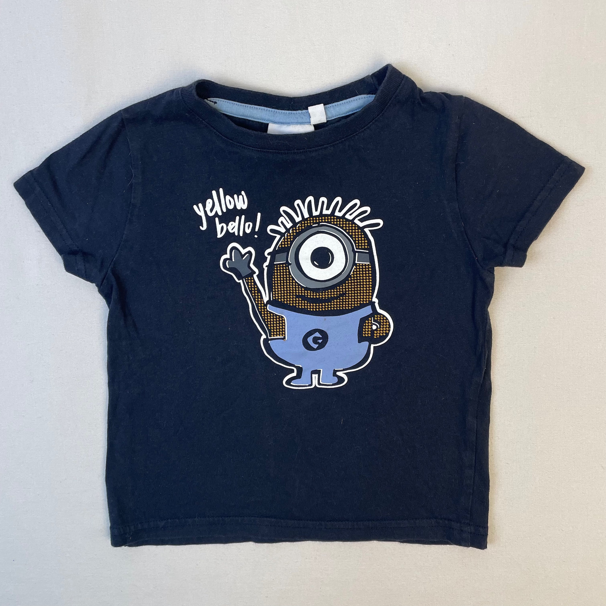 - T-shirt bleu foncé avec au centre un minion qui dis « yellow bello ! »