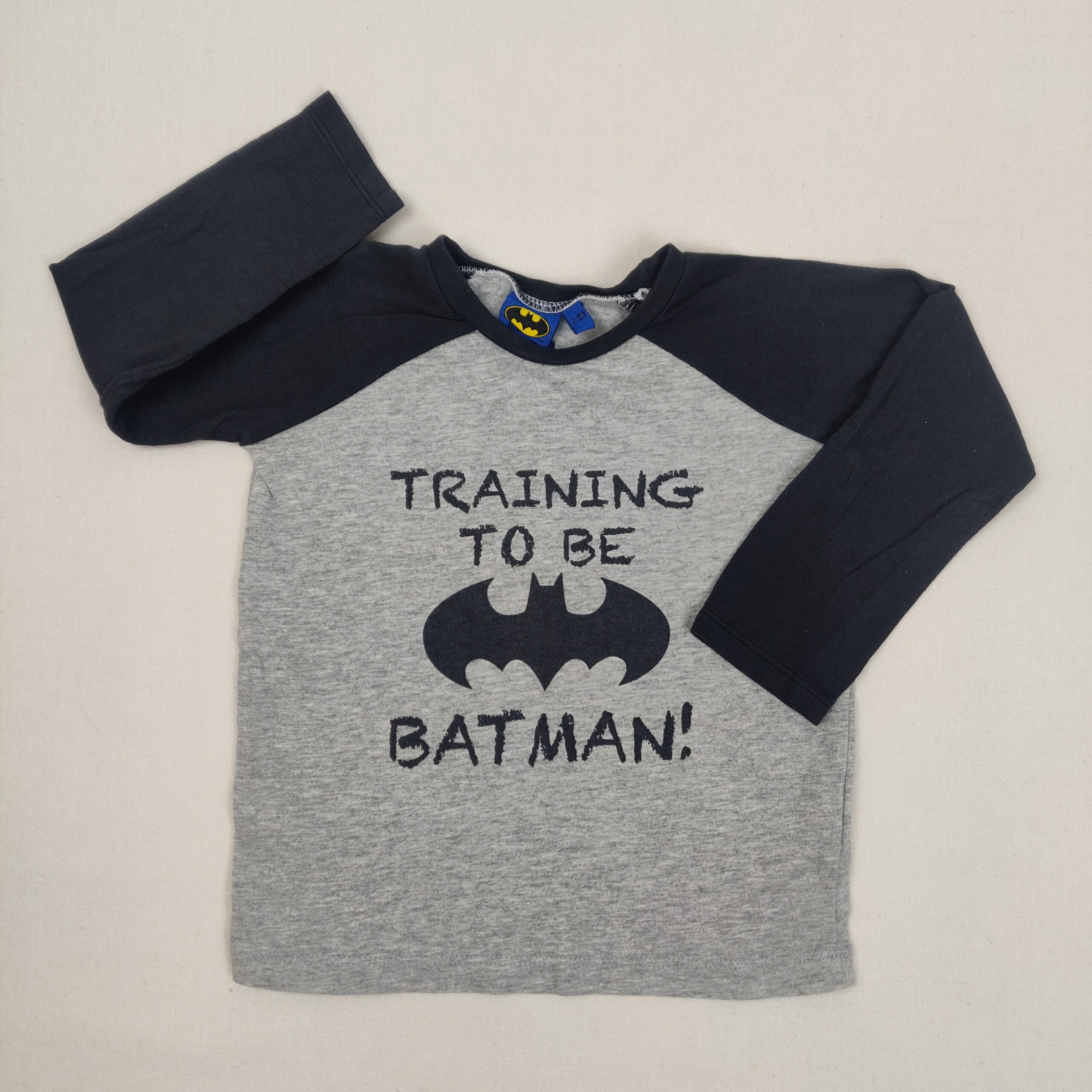 Autres commentaires : T-shirt gris à manches longues noires, inscription « training to be batman » à l’avant