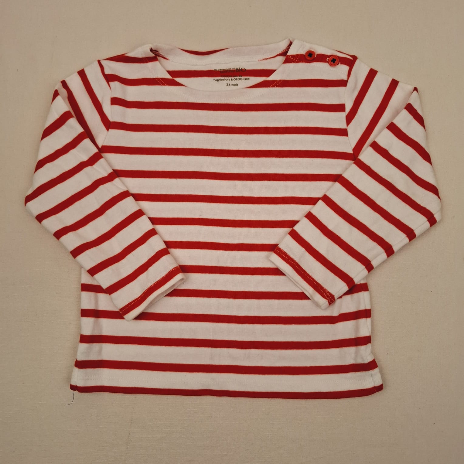 Autres commentaires : T-shirt blanc avec des rayures rouges, manches longues, col rond, fermeture par boutons au niveau de l’épaule gauche