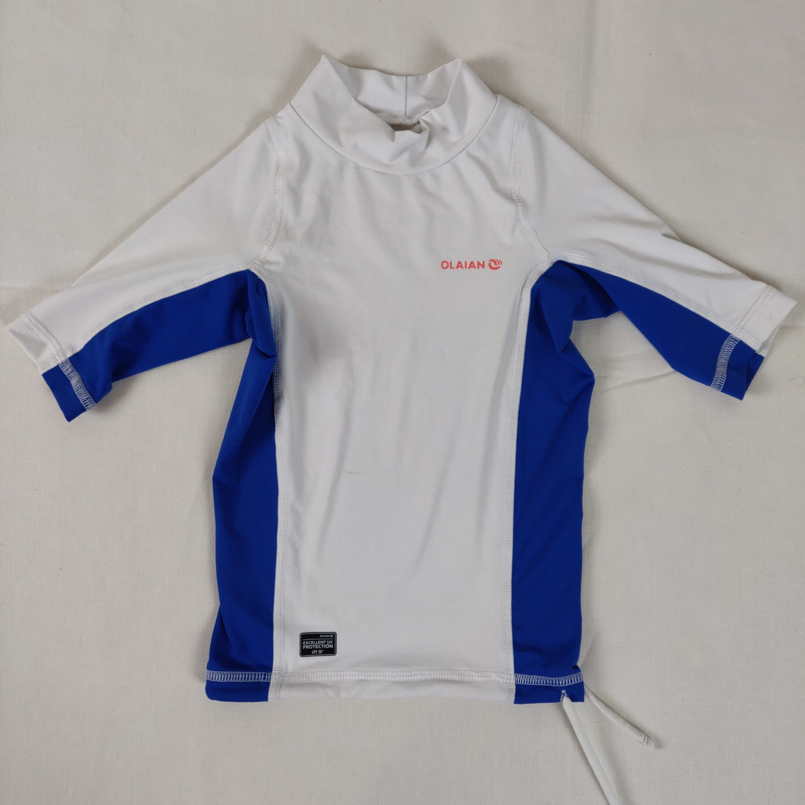Autres commentaires : T-shirt de plage anti-UV (indice 50+), blanc et bleu, manches 3/4, taille estimée 3-4 ans, cordon de resserrage en bas de maillot.