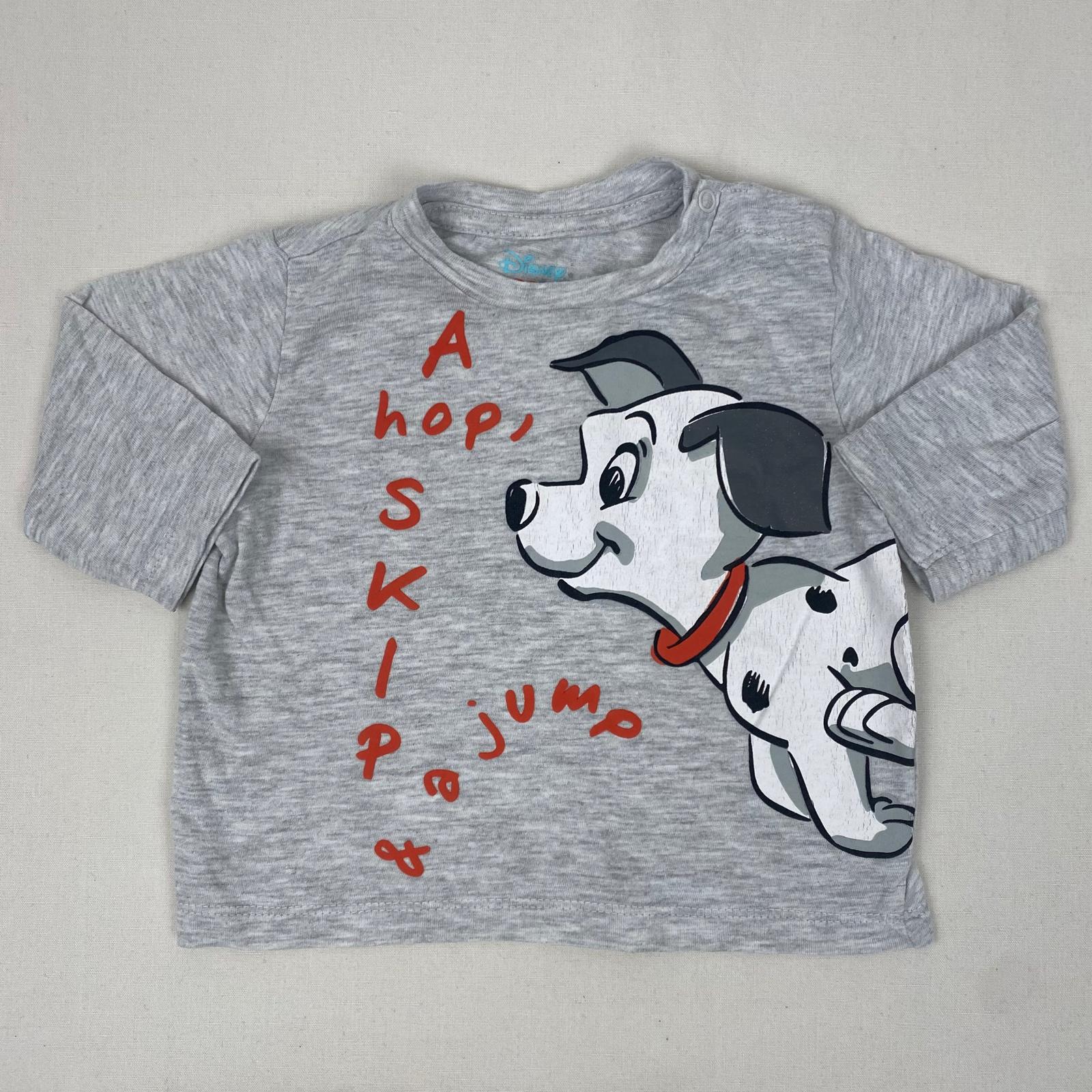 Autres commentaires : 2% polyester. T-shirt gris à manches longues, col rond, motif Les 101 Dalmatiens et inscription « A hop, skip and a jump », fermeture par boutons pression sur l’épaule gauche.