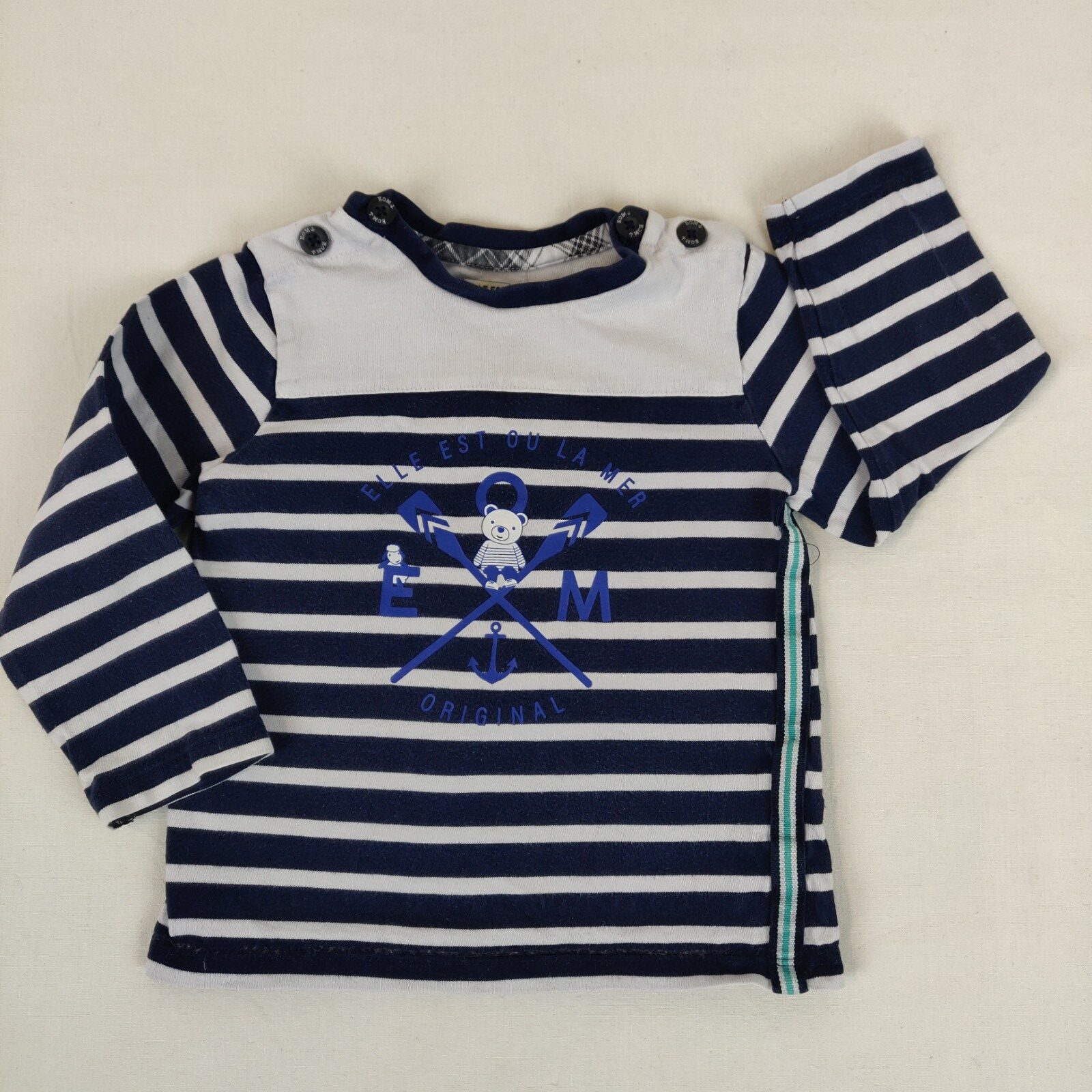 Autres commentaires : T-shirt bleu manches longues avec rayures blanches horrizontales et plastron blanc et une fermeture avec 2 boutons sur les 2 épaules. Contient 97% de coton et 3% d’elasthanne.