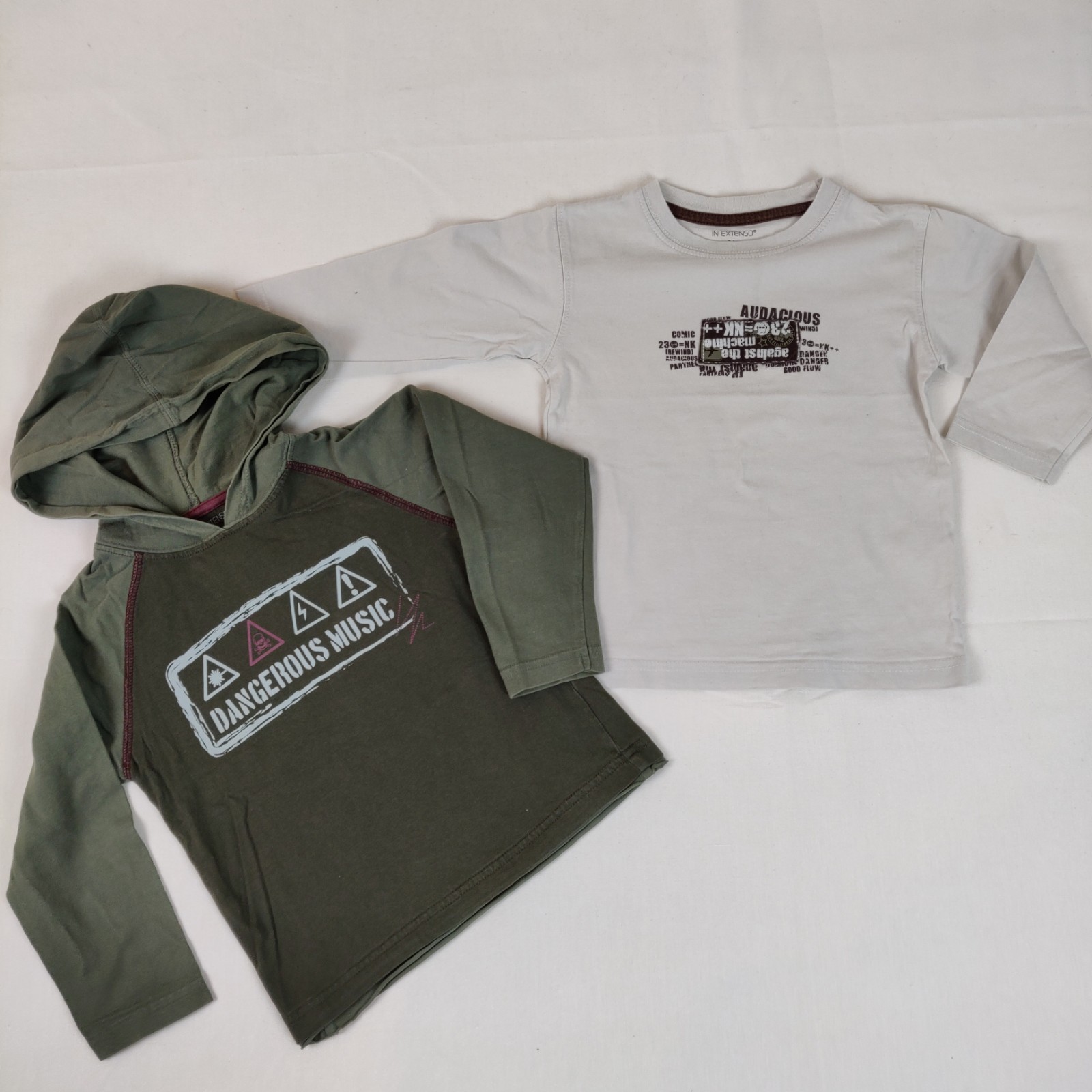 Autres commentaires : Lot de 2 t-shirts à manches longues. Un t-shirt à capuche vert kaki et marron. Motifs centraux panneaux de signalisation et inscription « Dangerous music ». Un t-shirt beige avec un écusson marron comprenant l’inscription « Against the machine ».