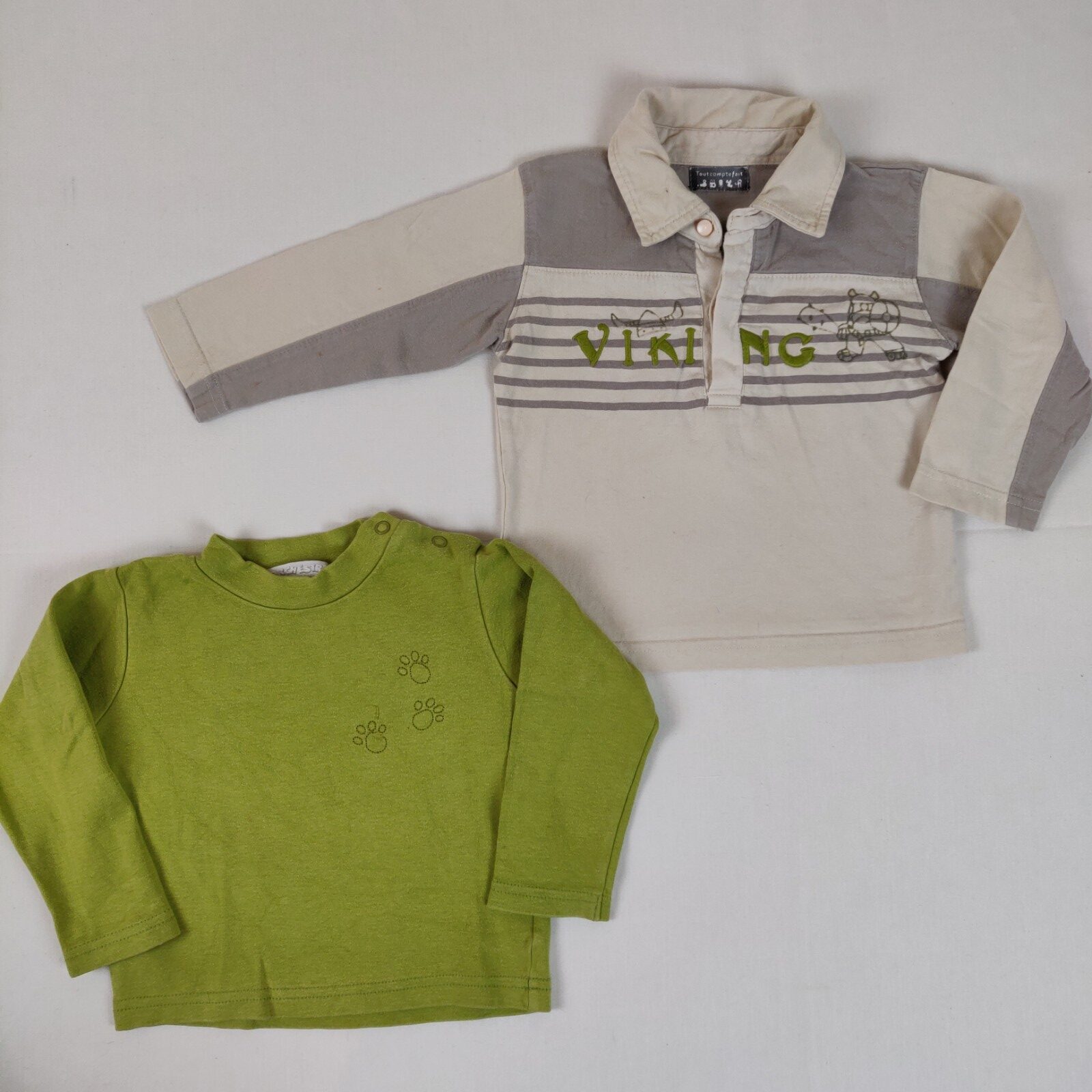 Autres commentaires : Lot de 2 pièces. T-shirt à manches longues « Orchestra » vert avec motifs centraux cousus empreintes d’ours. Ouverture latérale à 2 boutons pression. Léger effet pelucheux. Polo à manches longues » Tout compte fait » bicolore beige et gris. Motif central vicking avec inscription verte cousue « Vicking ». Ouverture centrale à un bouton pression et un bouton classique. Léger effet pelucheux.