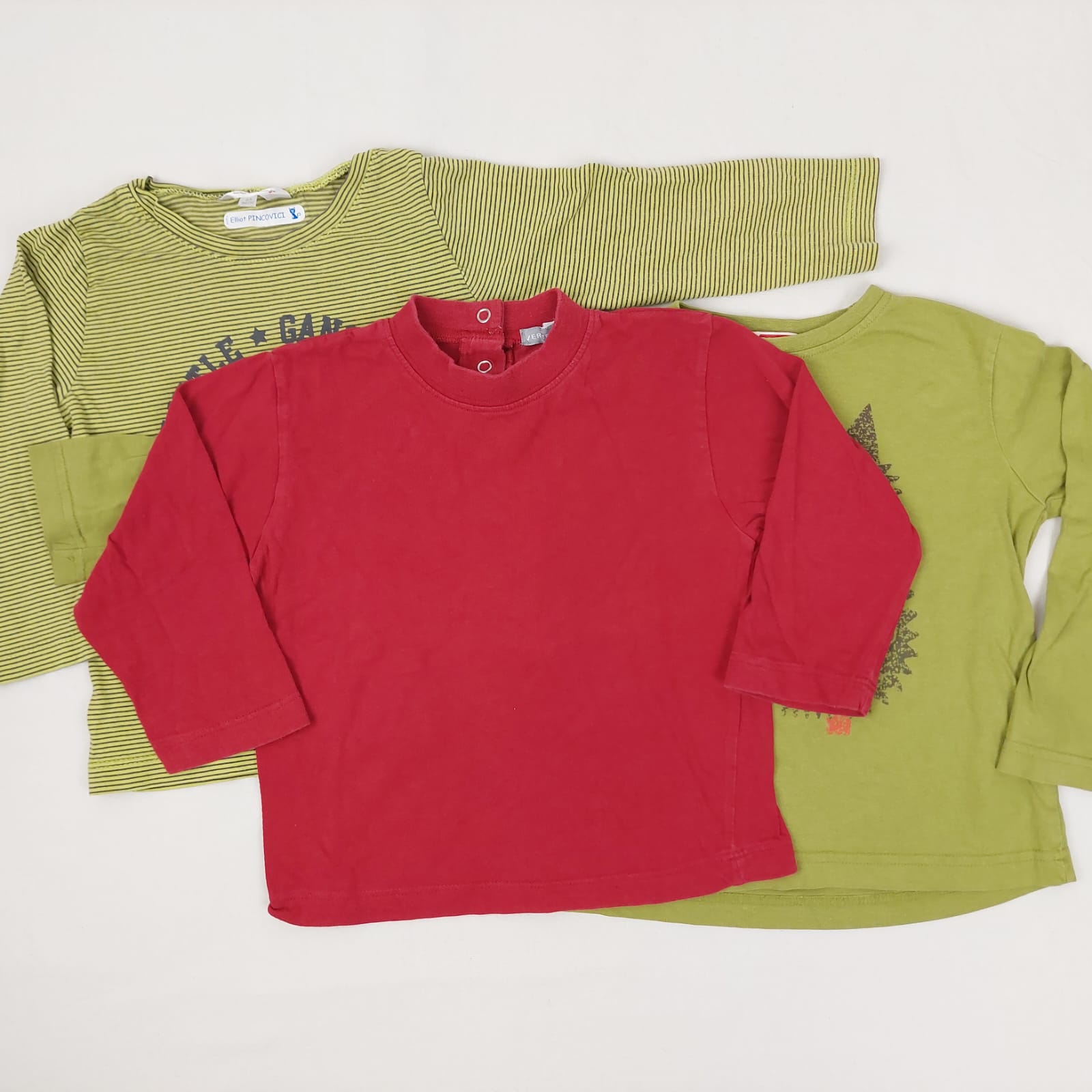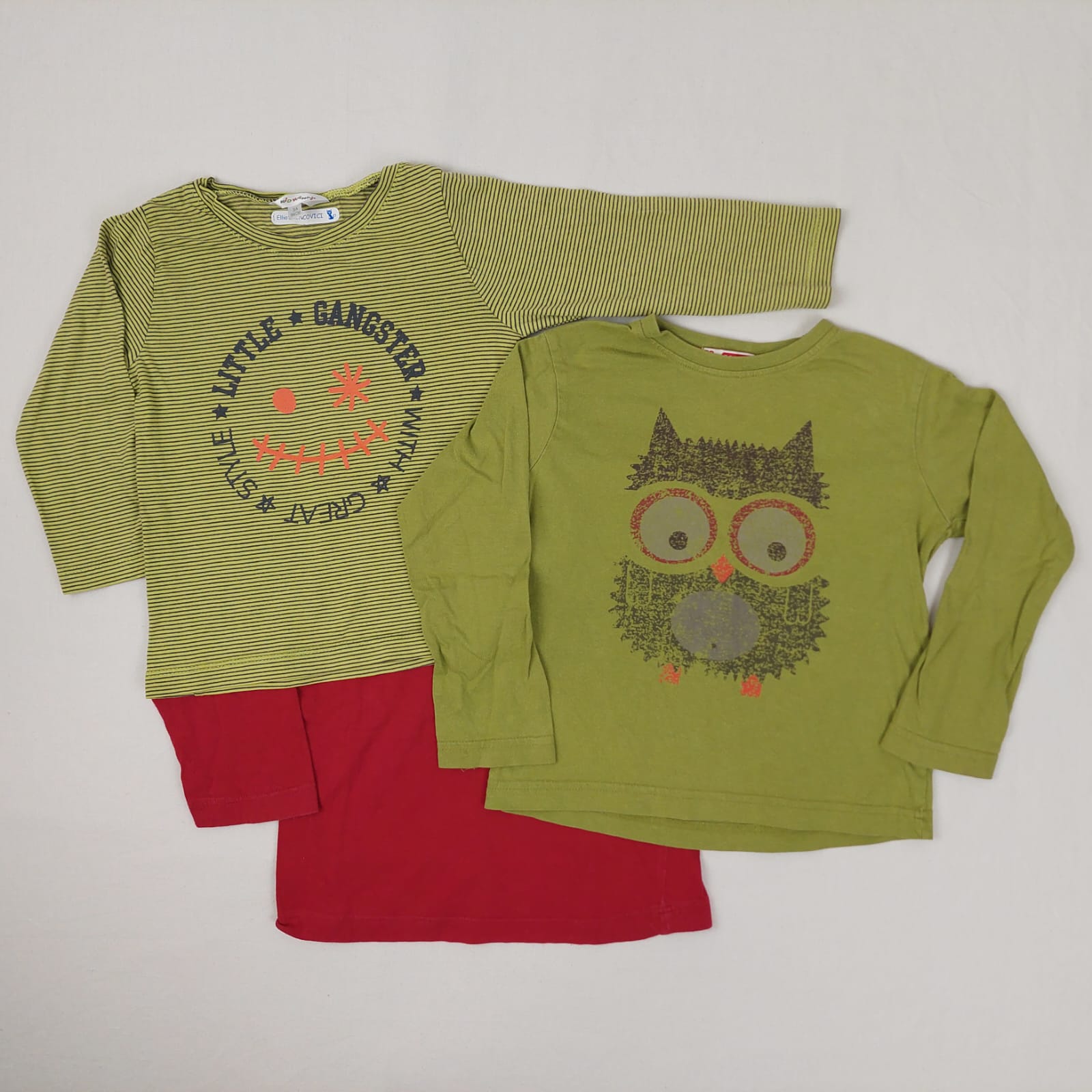 Autres commentaires : Lot 3 t-shirts manches longues, un Du Pareil au Même vert imprimé hibou, un KidKanaï vert rayé gris, imprimé émoji gangster, un Verbaudet rouge uni,col pressionné au dos