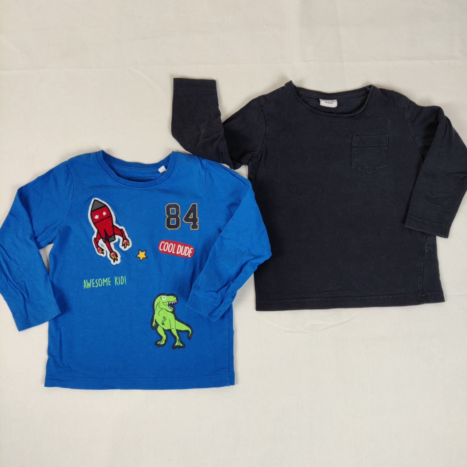 Autres commentaires : Lot de 2 t-shirts à manches longues. Un t-shirt C&A bleu avec motifs fusée et dinosaure et inscription « Cool dude. Awesome kid! ». Un t-shirt « Tape à l’oeil » noir avec pochette centrale. Usure normale du vêtement.