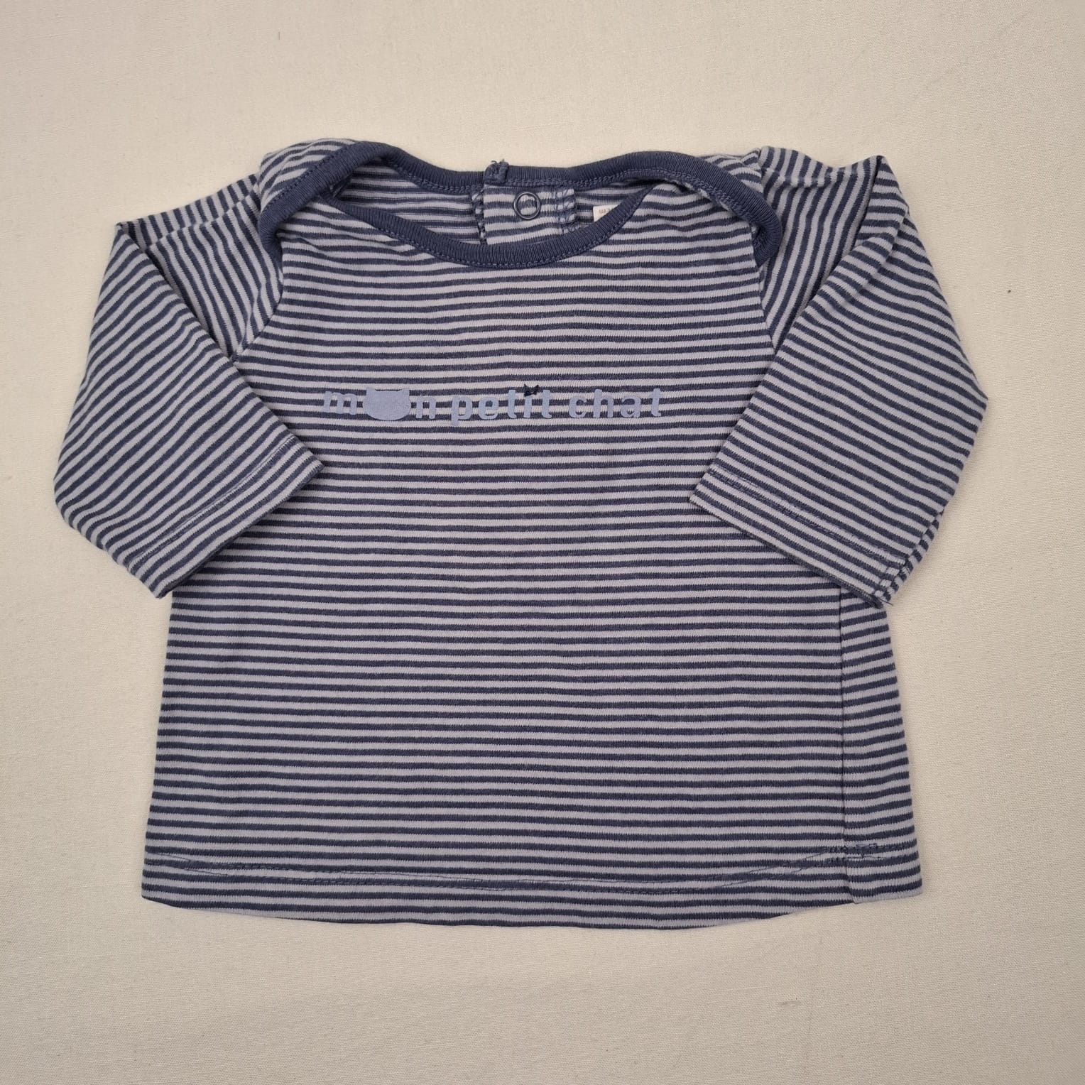 Autres commentaires : T-shirt manches longues, à rayures gris mauve et bleues, devant inscription « Mon petit chat » en bleu, encolure US, fermeture en haut du dos par boutons pression, de joueurs de baby-foot bleus et rouges avec inscription « ready to play », col arrondi, surpiqûres en rouge.