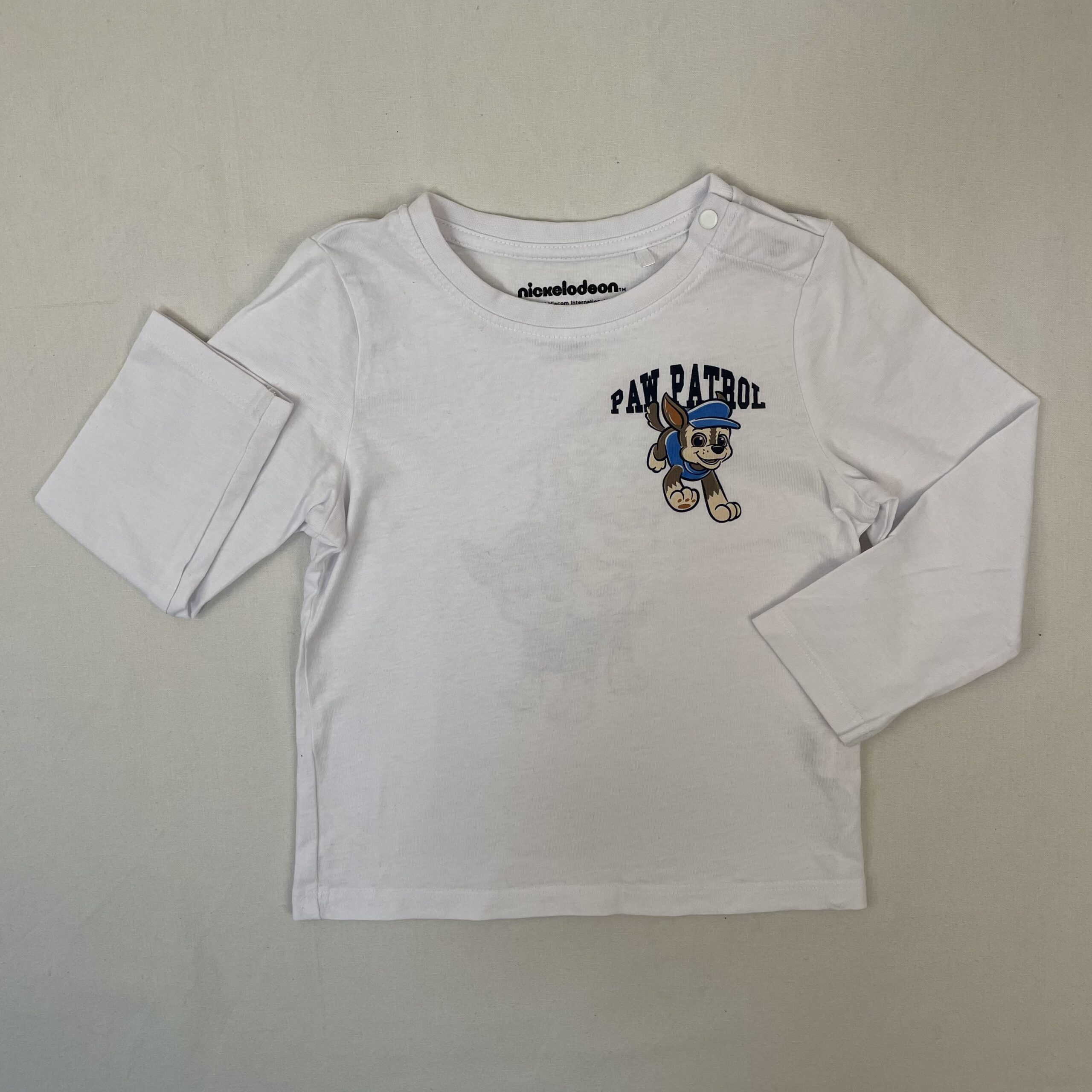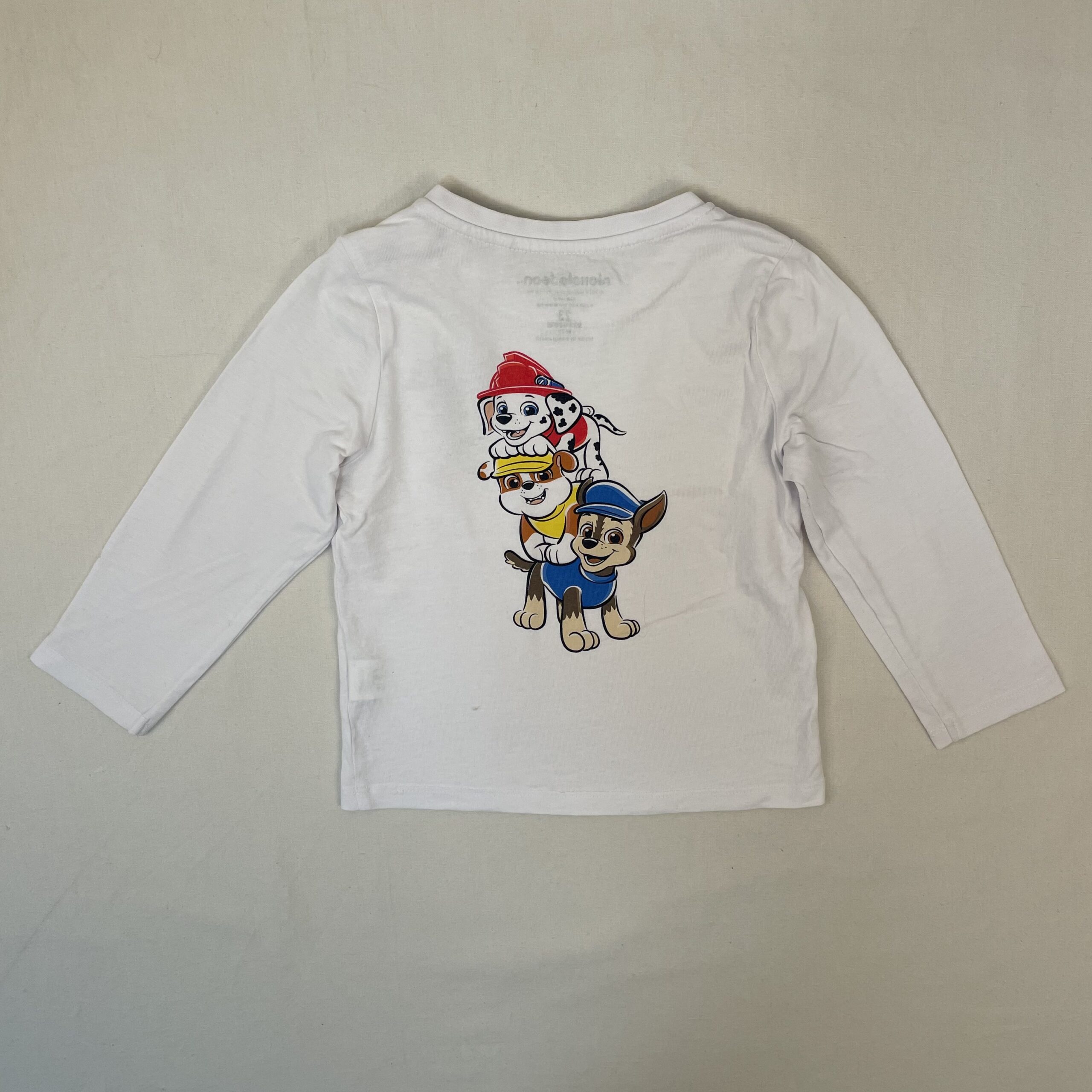 - T-shirt à manches longues blanc, motif personnage de Chase de Pat Patrouille devant, au dos, personnages de Chase, Ruben et Marcus, fermeture à l’épaule gauche par boutons pression.