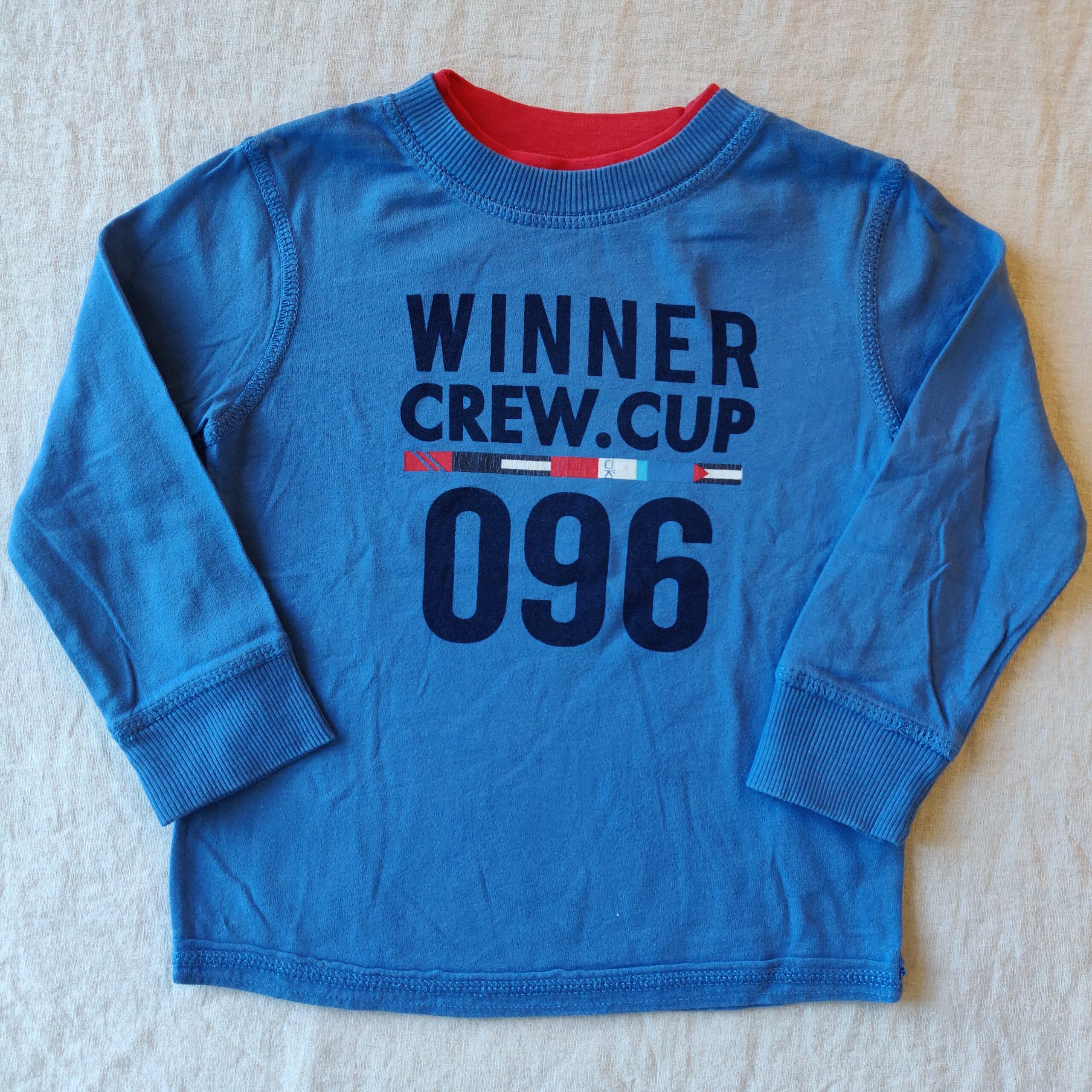 Autres commentaires : T-shirt manches longues bleu et effet double t-shirt col rouge, inscription « winner crew cup »