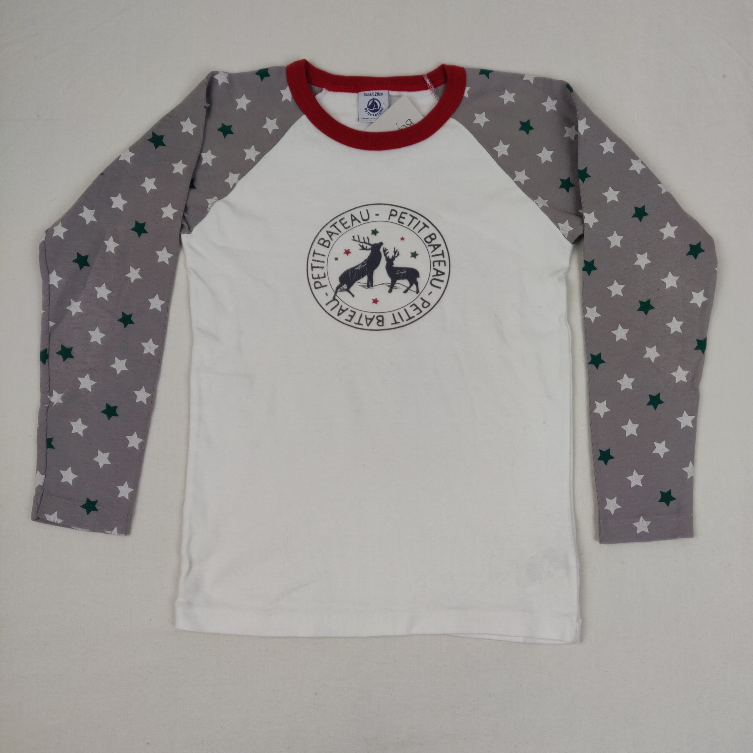 Autres commentaires : T-shirt manches longues blanc avec manches grises, col rouge et motif Petit Bateau.