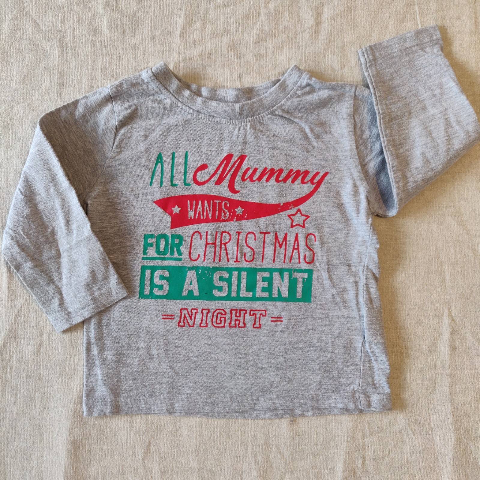 Autres commentaires : 7% polyester. T-shirt pour occasion spéciale NOEL, inscription en rouge et vert « all Mummy wants for Christmas is a Silent Night »
