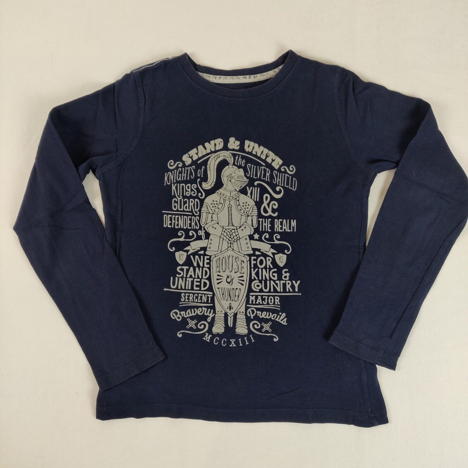 Autres commentaires : T-shirt à manches longues – bleu marine avec motif central gris chevalier en armure accompagné de diverses inscriptions.