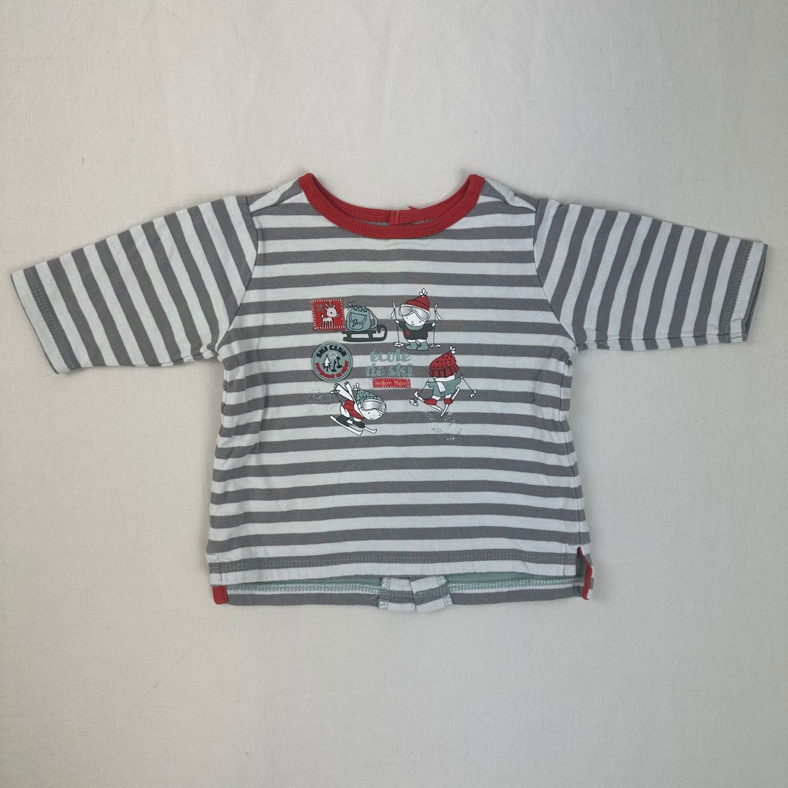 Autres commentaires : T-shirt manches longues blanc avec rayures gris et une fermeture au dos par boutons pressions.