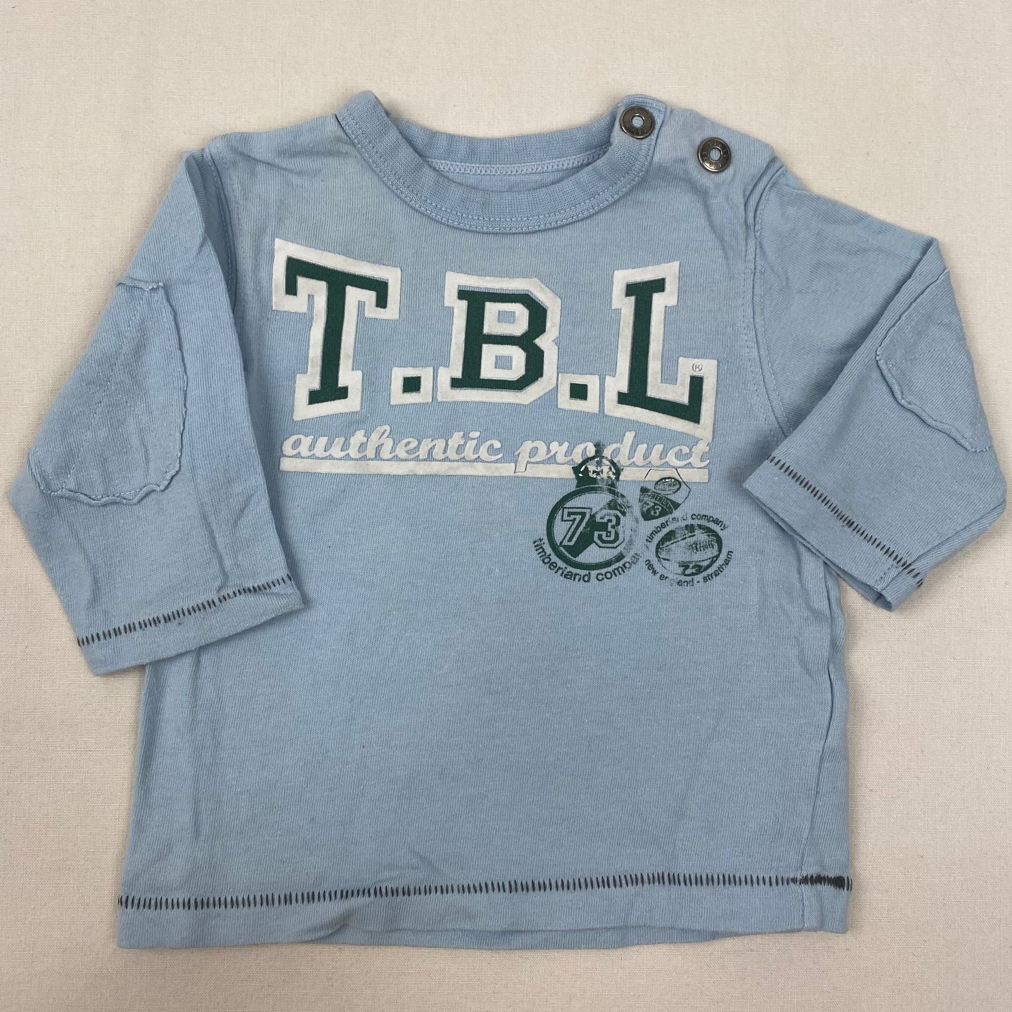 Autres commentaires : T-shirt manches longues bleu ciel. Inscription ‘TBL Authentic Production’ en vert sapin, avec contours blancs en velours. Boutons pression à l’épaule gauche pour faciliter l’habillage.