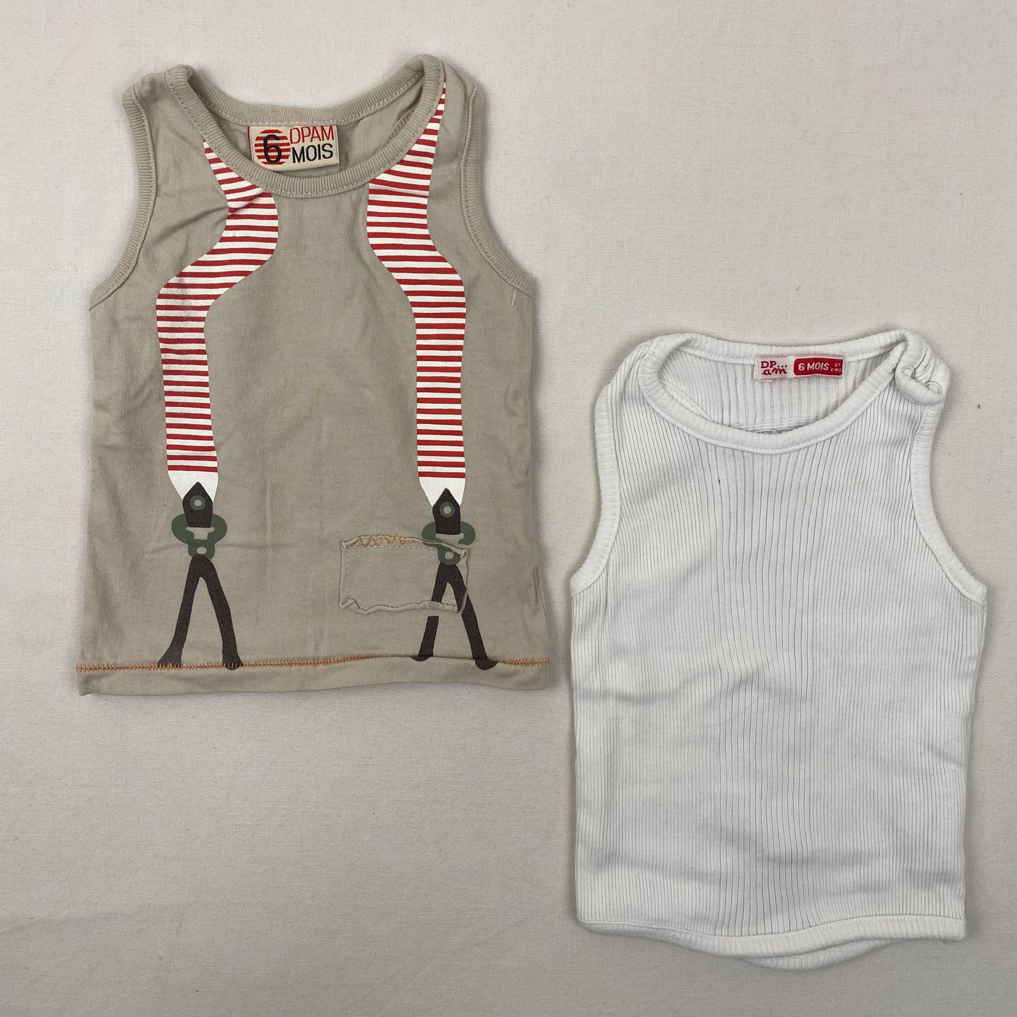 Lot de 2 t-shirts sans manches, style Marcel dont 1 beige sable avec un motif trompe-l’oeil de bretelles rayées rouges et blanches, en jersey et un blanc cassé uni en coton côtelé avec une petite étiquette couelur sable en haut du dos avec petite inscription DPAM en violet dessus.