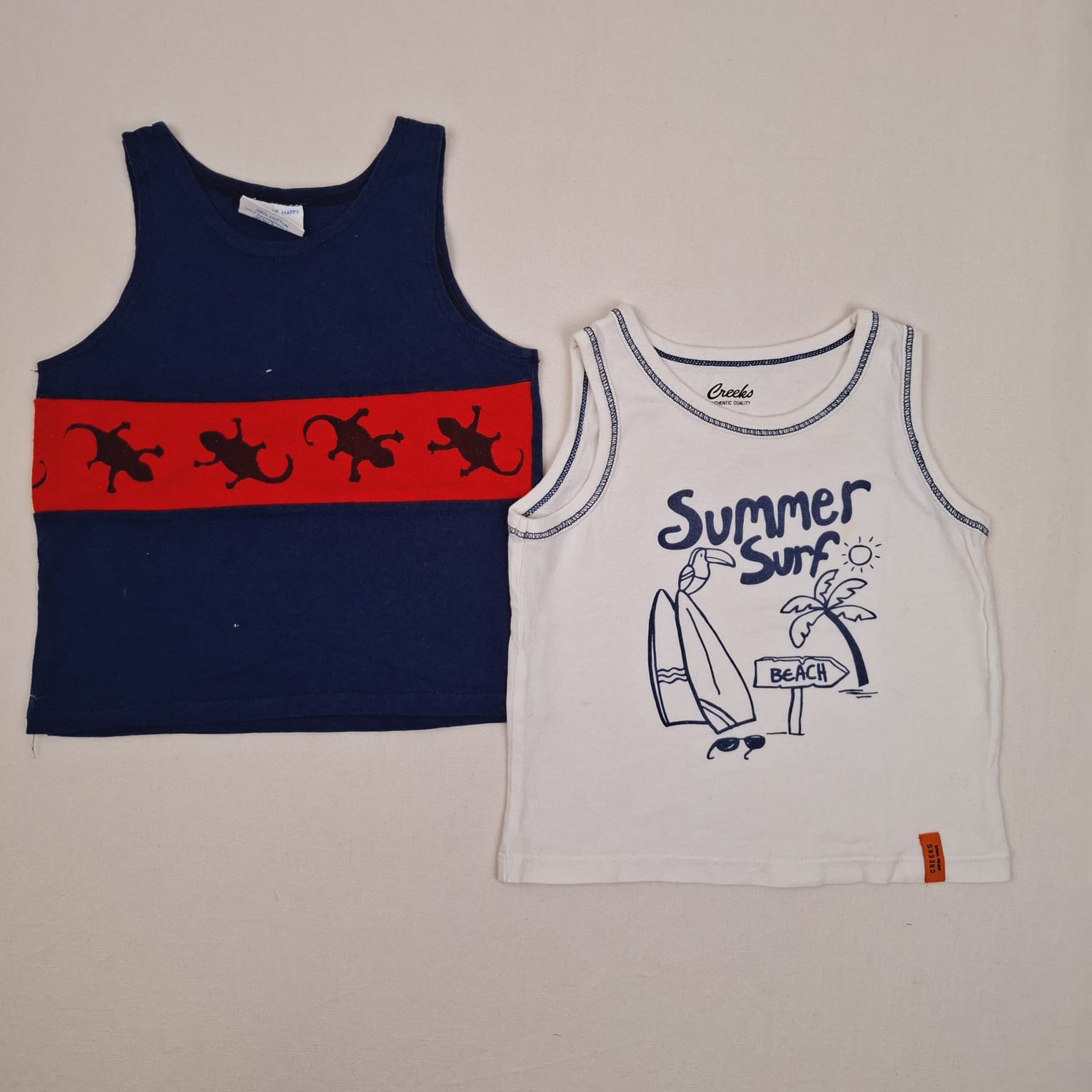 Autres commentaires : Lot de 2 débardeurs, 12 mois: – Débardeurs blanc avec finitions bleu, Creeks, inscription « Summer surk » avec des illustration de plage à l’avant du vêtement
