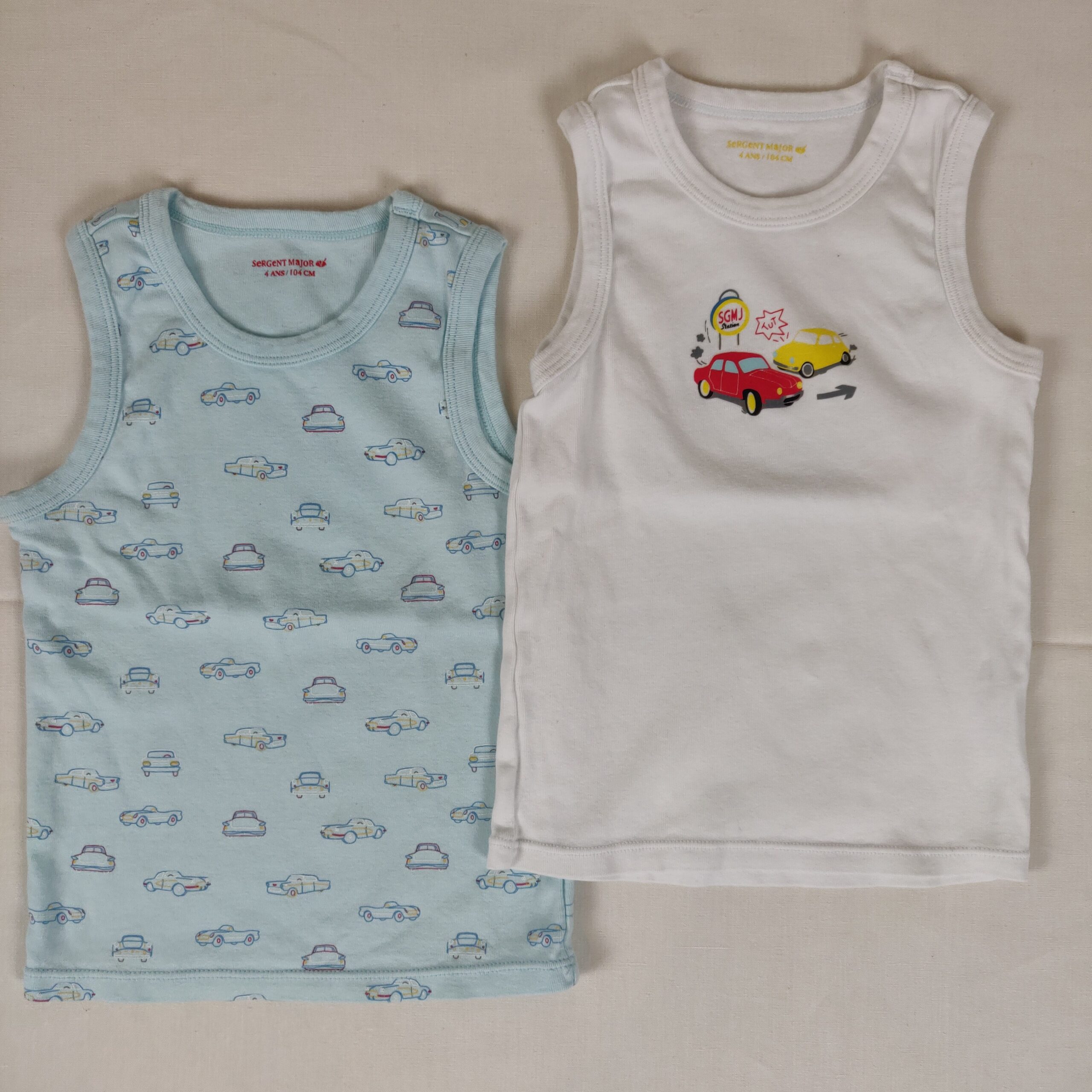 Autres commentaires : Lot de 2 débardeurs sur le thème des voitures anciennes : un bleu ciel avec petits desins rouges, jaunes et blancs, un blanc avec dessin de voitures rouge et jaune.