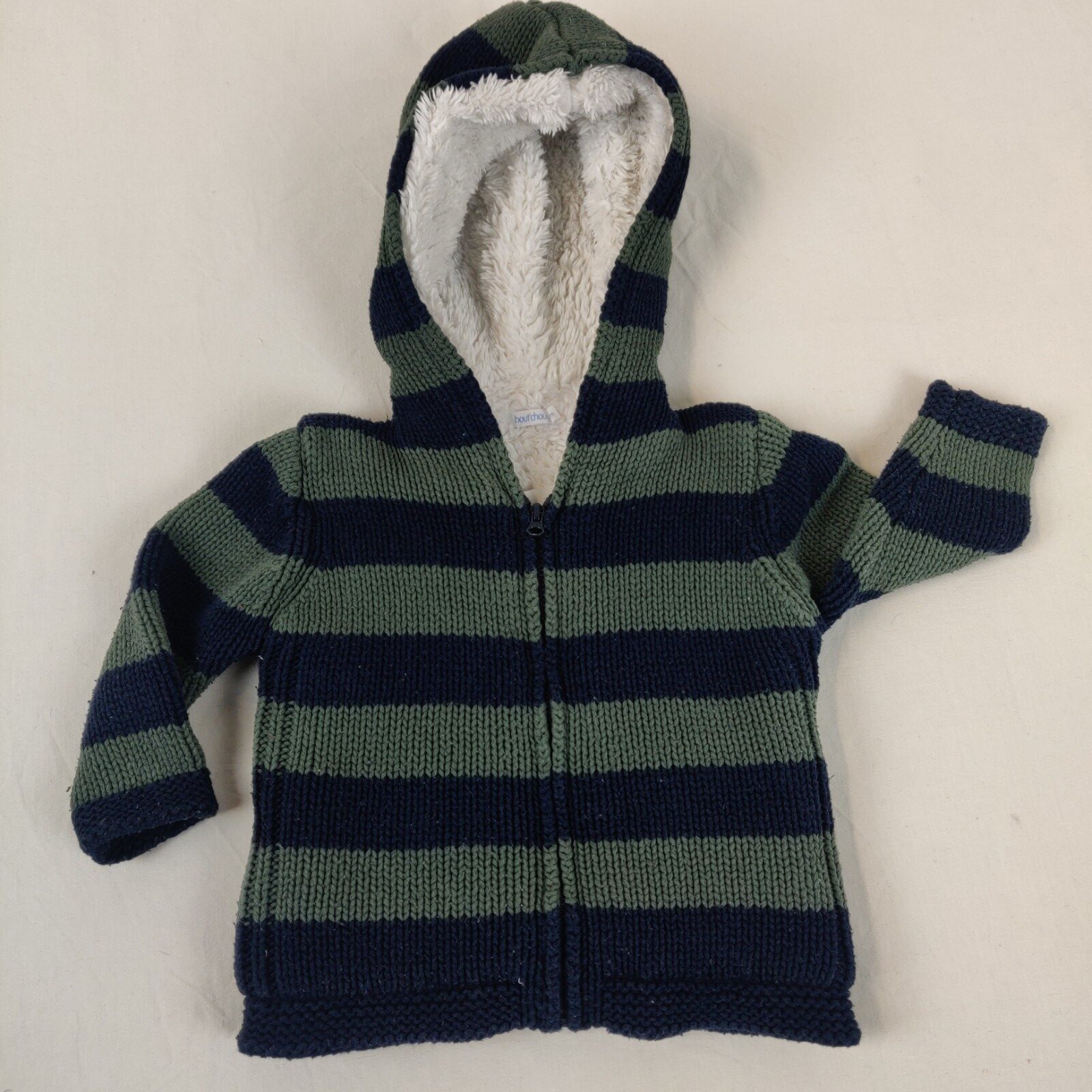 Autres commentaires : Veste doublée en fourrure synthétique à capuche rayée bleu marine et vert. Ouverture centrale zippée.