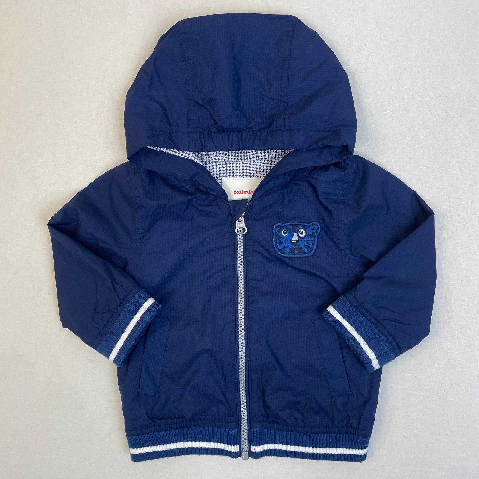 Veste bleu marine à capuche, fermeture par zip, poignets et chevilles élastiqués, avant gauche patch tête de tigre, doublure motif pied de poule bleu clair et blanc en 100% polyester.