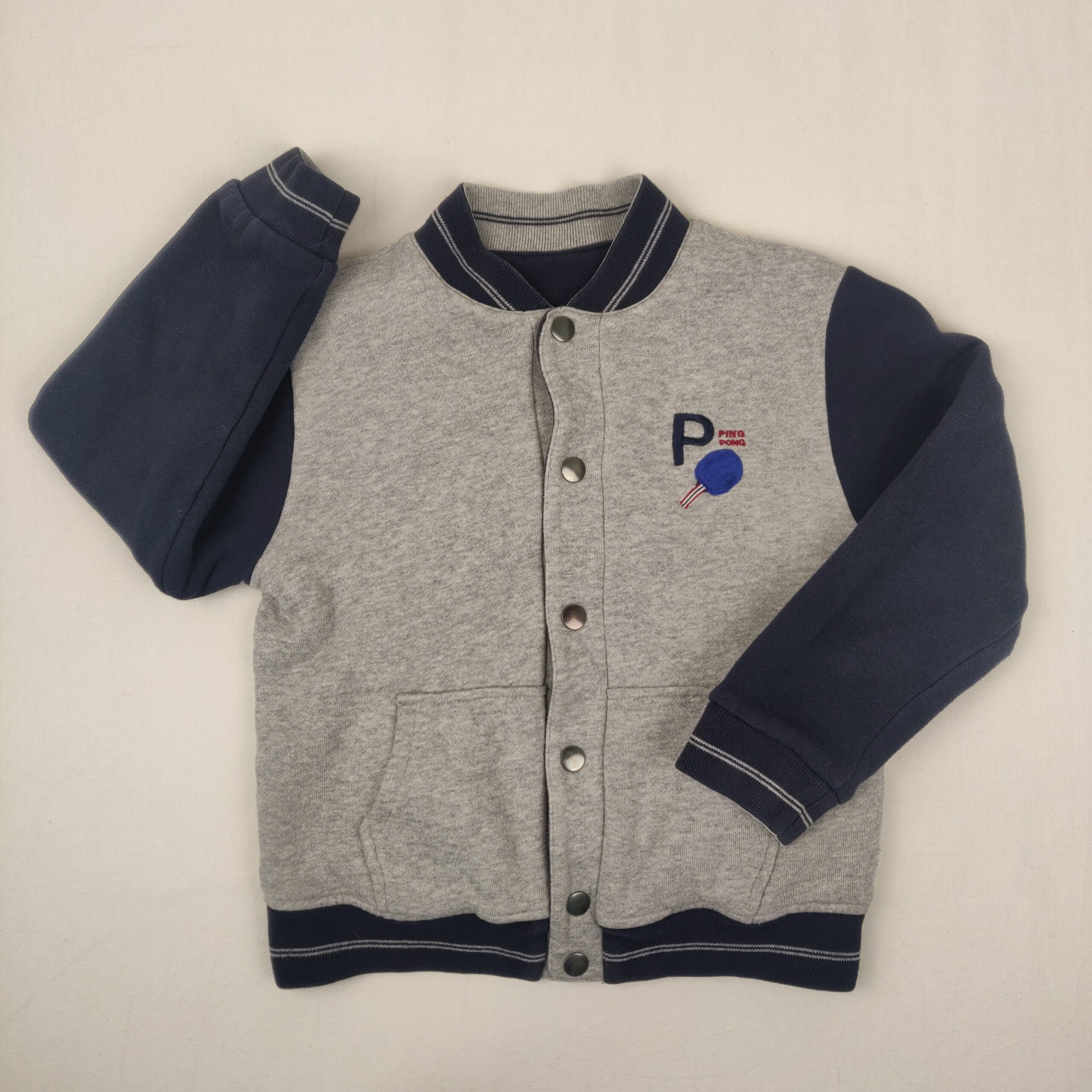 - Veste bleu à manches grises, fermeture à l’avant par boutons pressions