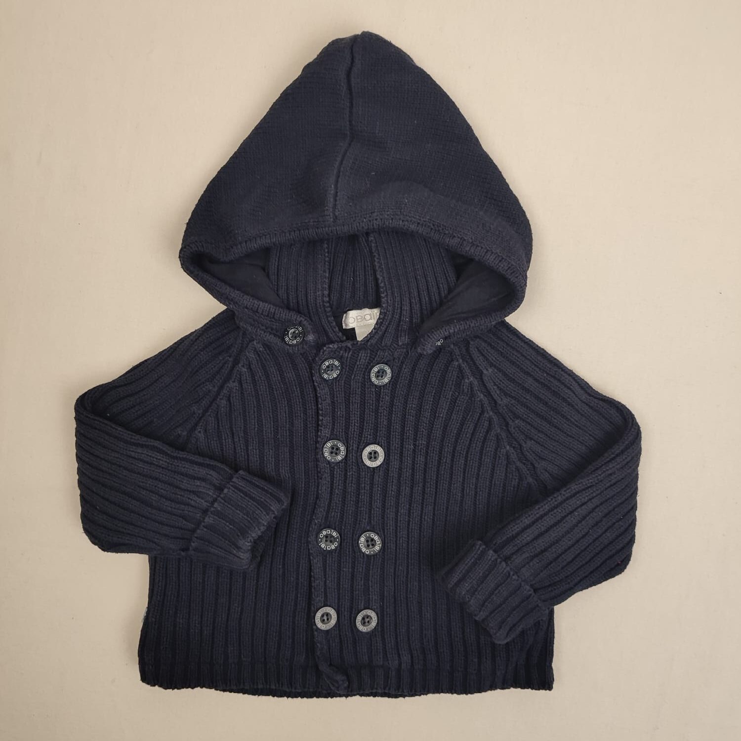Autres commentaires : Gilet-veste uni bleu foncé en maille côtelée, à capuche amovible par boutons, col camionneur, fermeture devant par une double boutonnière.