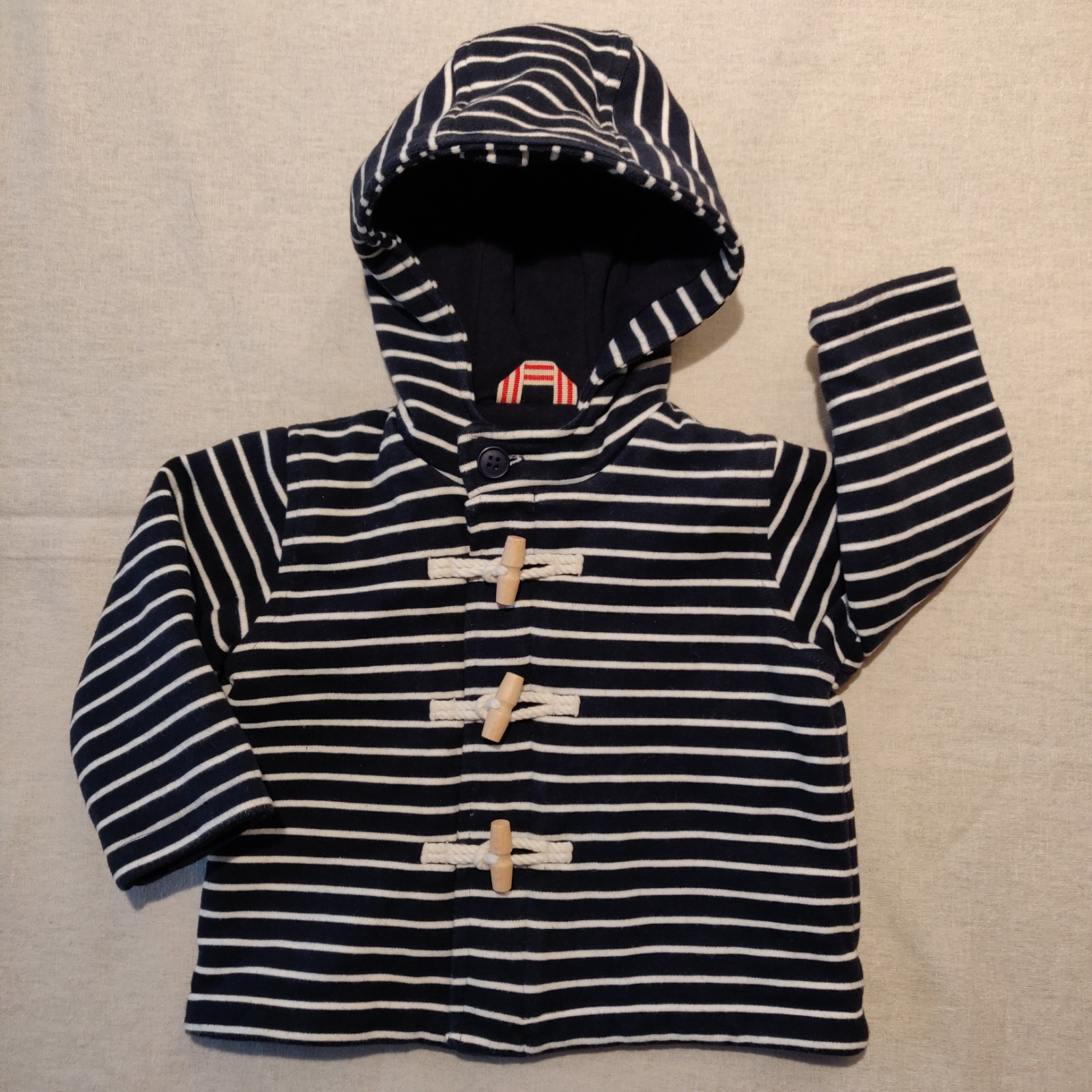 Autres commentaires : Veste marinière à capuche, esprit duffle coat, fermeture à zip doublée de boutons brandebourg.