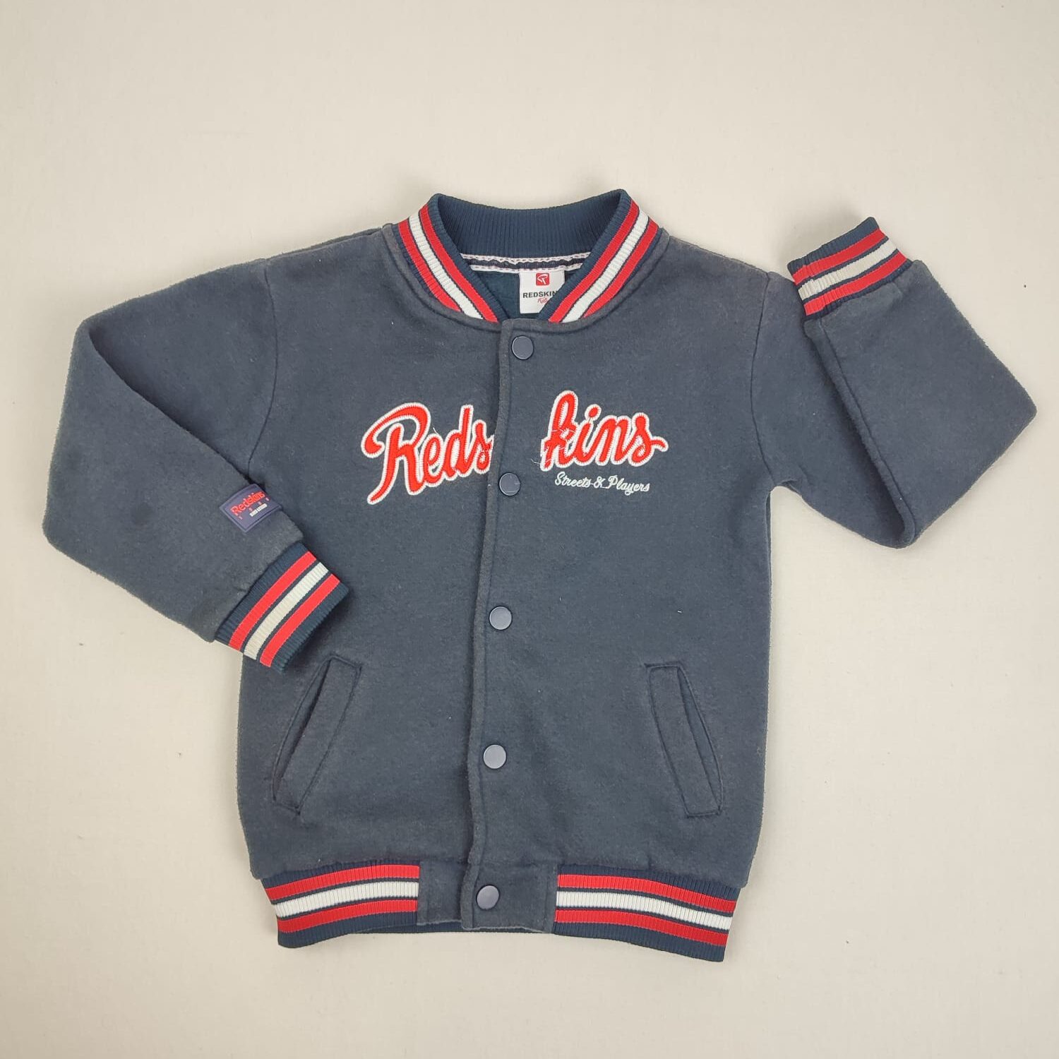 Autres commentaires : 30% coton – Veste teddy en polaire gris foncé, col et poignets élastiqués rayés rouge, blanc et noir, intérieur effet molletonné, inscription centrale en rouge et blanc « redskins » « Streets & Players », poches latérales, fermeture devant par boutons pression. – légères bouloches d’usure.