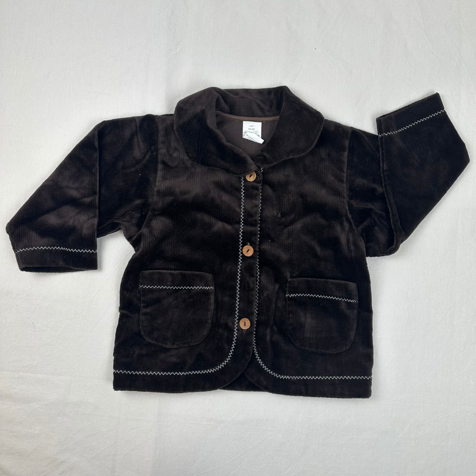 Autres commentaires : Veste marron en velours manches longues, col claudine, 2 poches latérales et une fermeture par boutons.