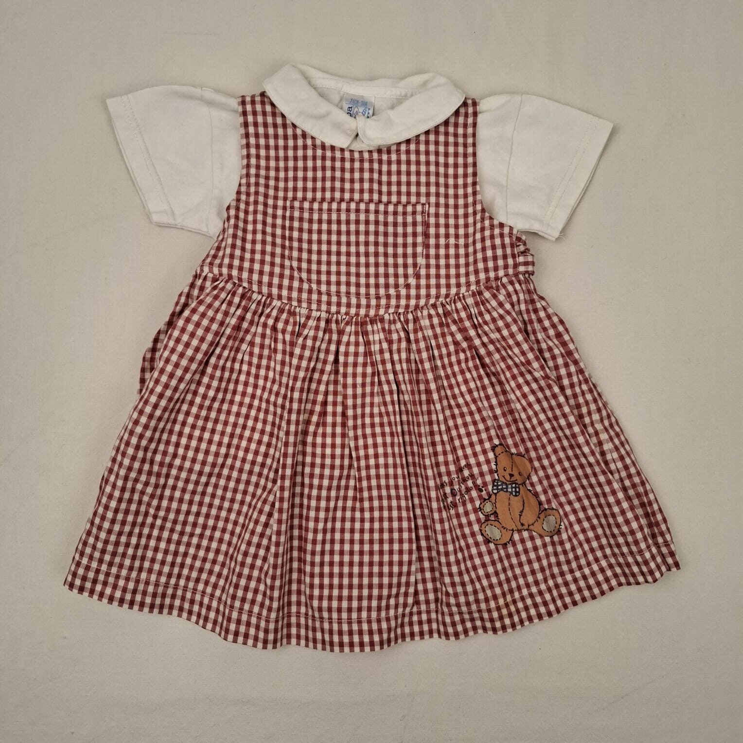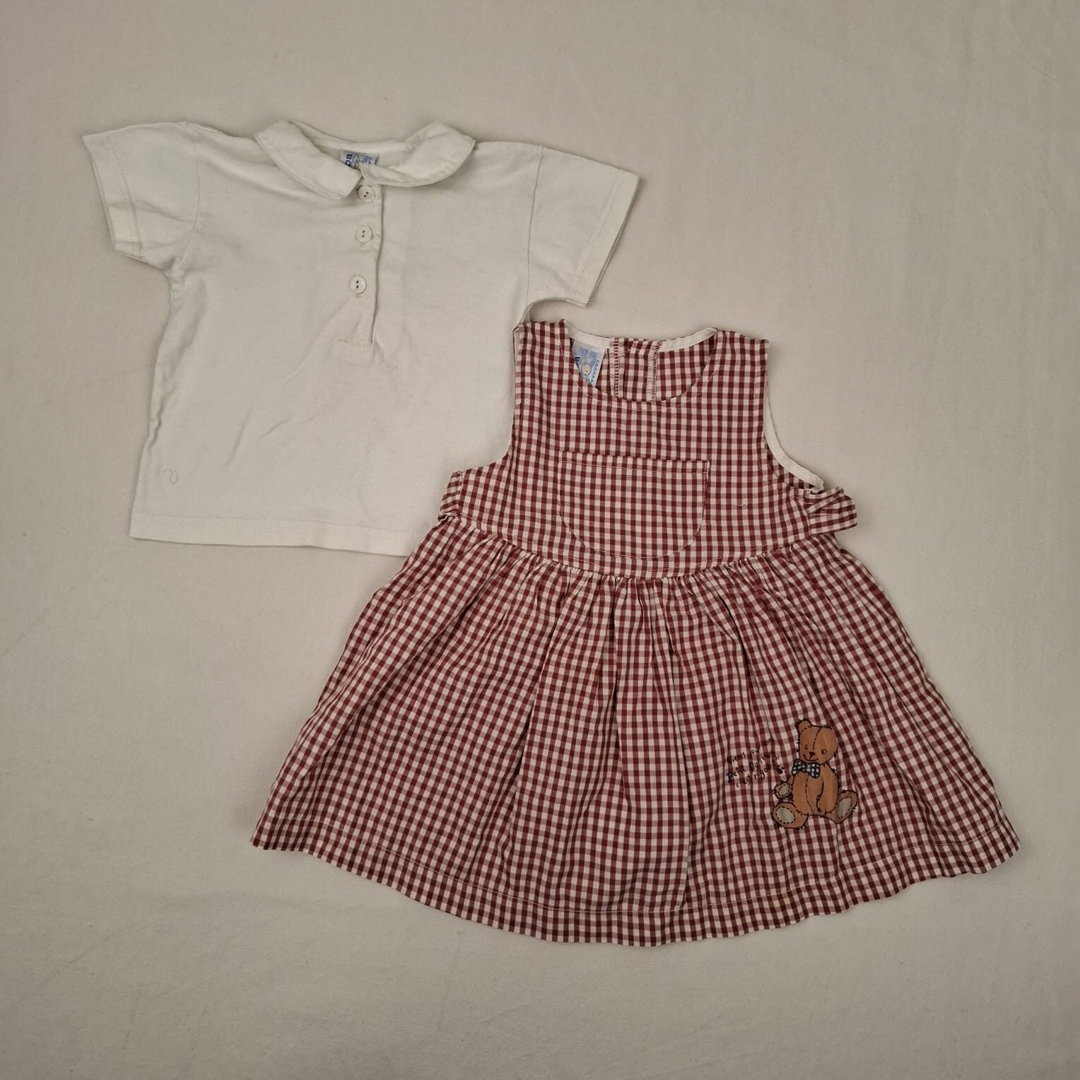 Autres commentaires : Ensemble 2 pièces: – T-shirt blanc uni à manches courtes, col Claudine, fermeture par boutons devant. – Robe rouge à carreaux sans manches, motif ours et inscription « Viens jouer avec Petit Oursinou c’est rigolo!! », col rond, poche plaquée centrale, fermeture par boutons au dos, petite tâches devant et derriere, ceinture intégrée, 100% coton.
