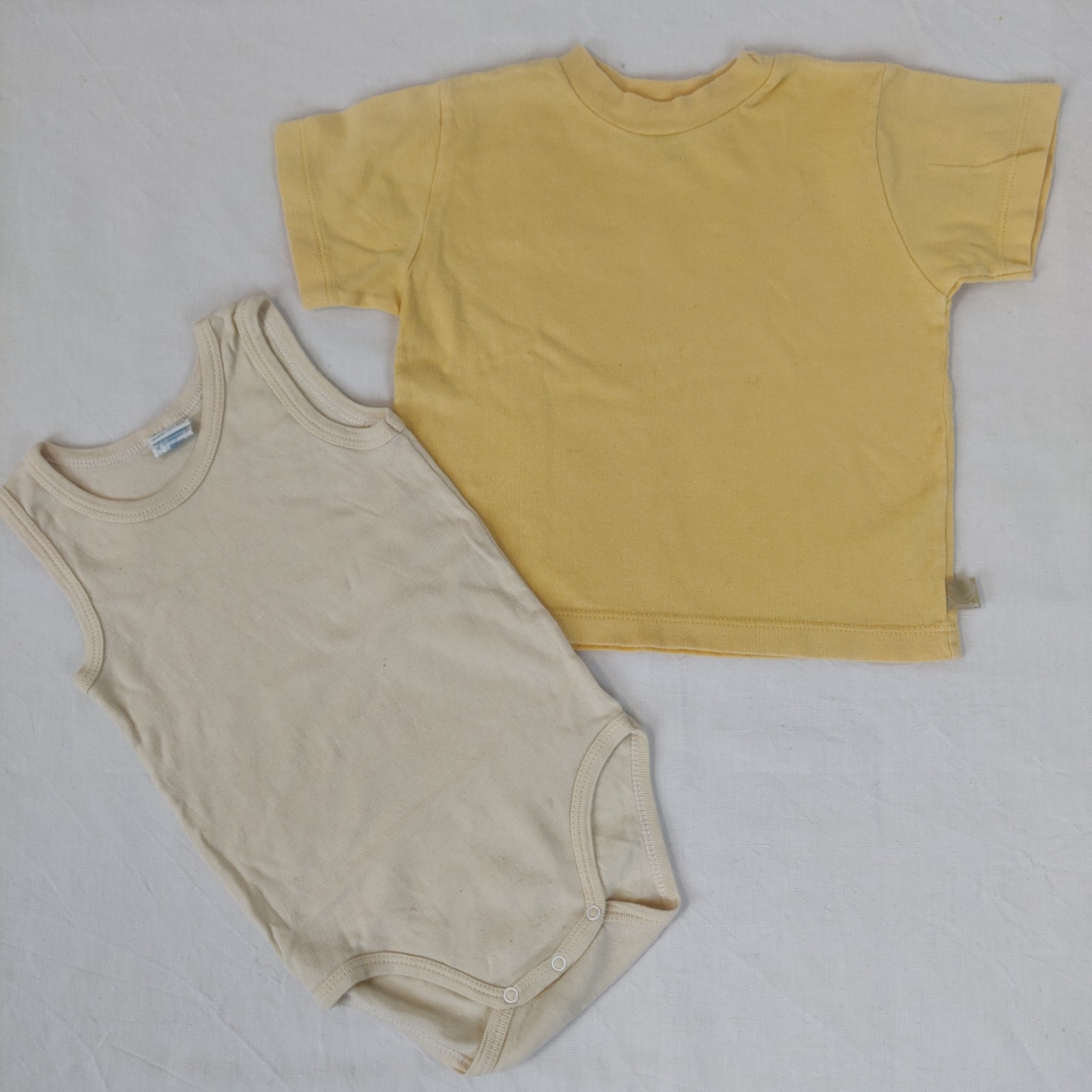 Autres commentaires : Ensemble 2 pièces. Un body sans manche – jaune clair uni. Un t-shirt à manches courtes jaune uni. Usure normale des vêtements.