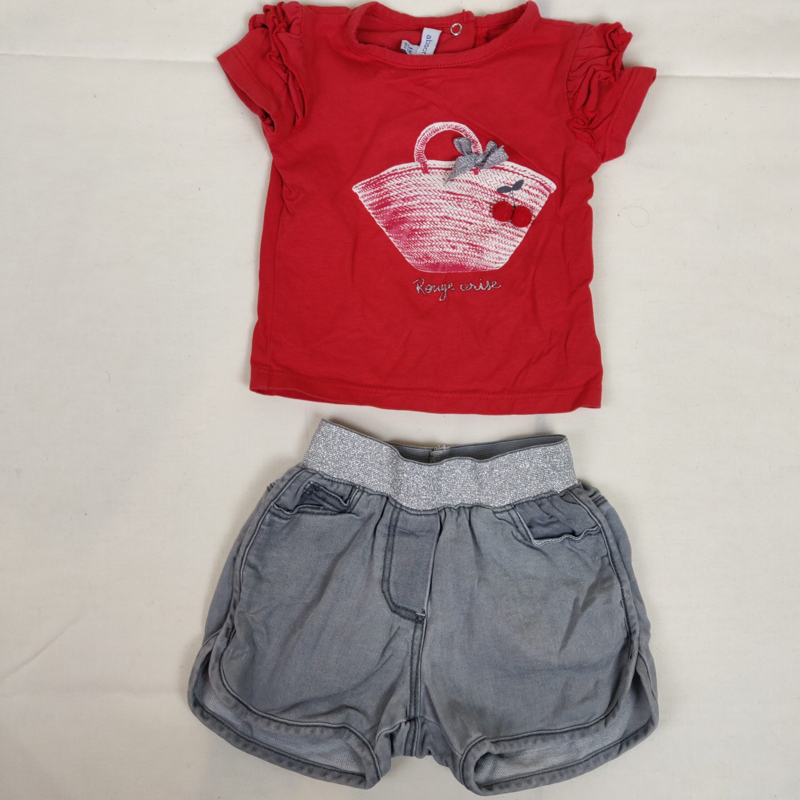 Autres commentaires : T-shirt manches courtes rouge avec panier écru et noeud gris argenté, deux cerises, inscription « Rouge cerise », fermeture par deux boutons t 1 short pression, volants aux manches. Short 21% polyester, 5% viscose, 1% Elasthanne, gris avec ceinture élastique argentée.