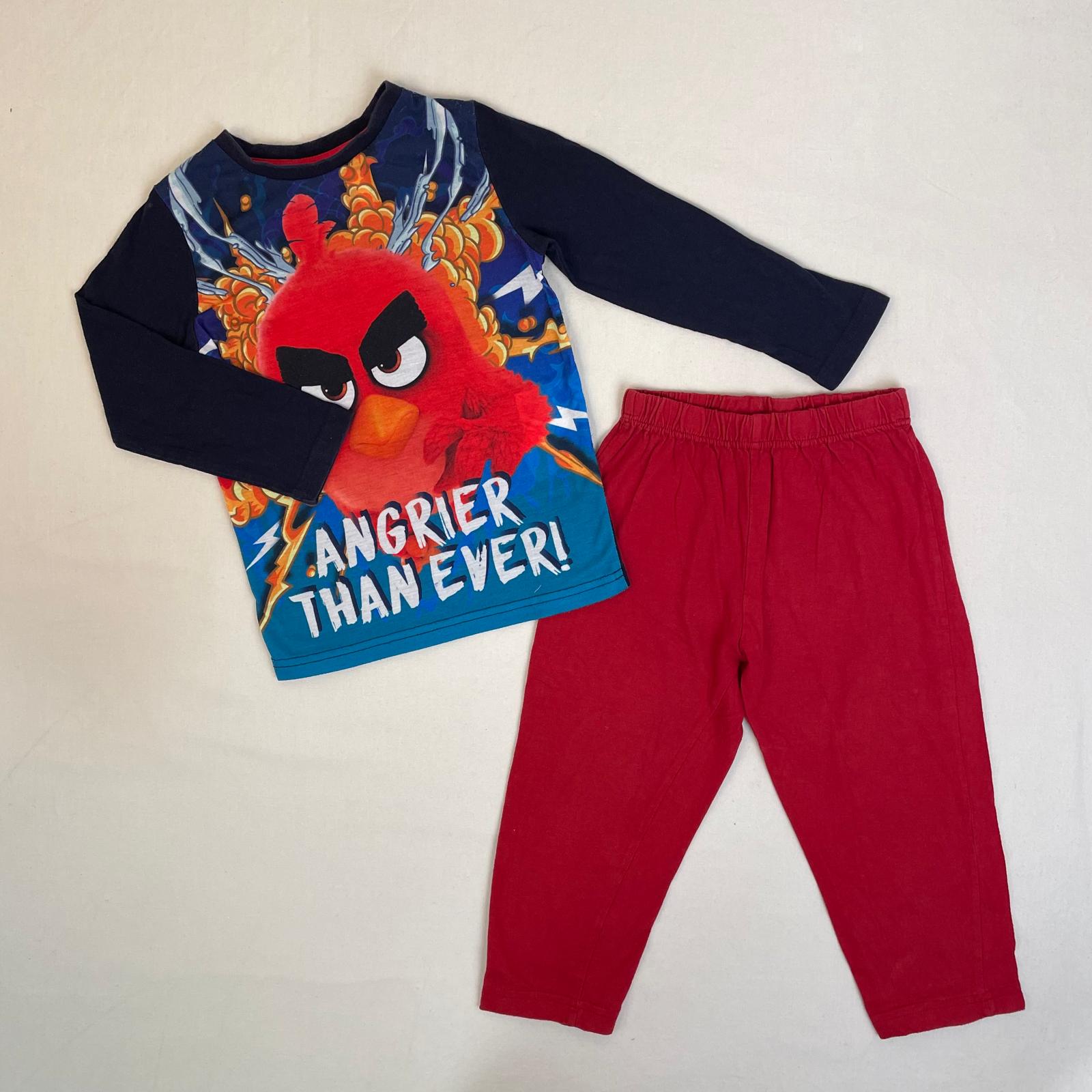 Ensemble 2 piéces: T-shirt bleu foncé, manches longues, col rond, motif Angrry birds rouge; Pantalon rouge, taille élastique.