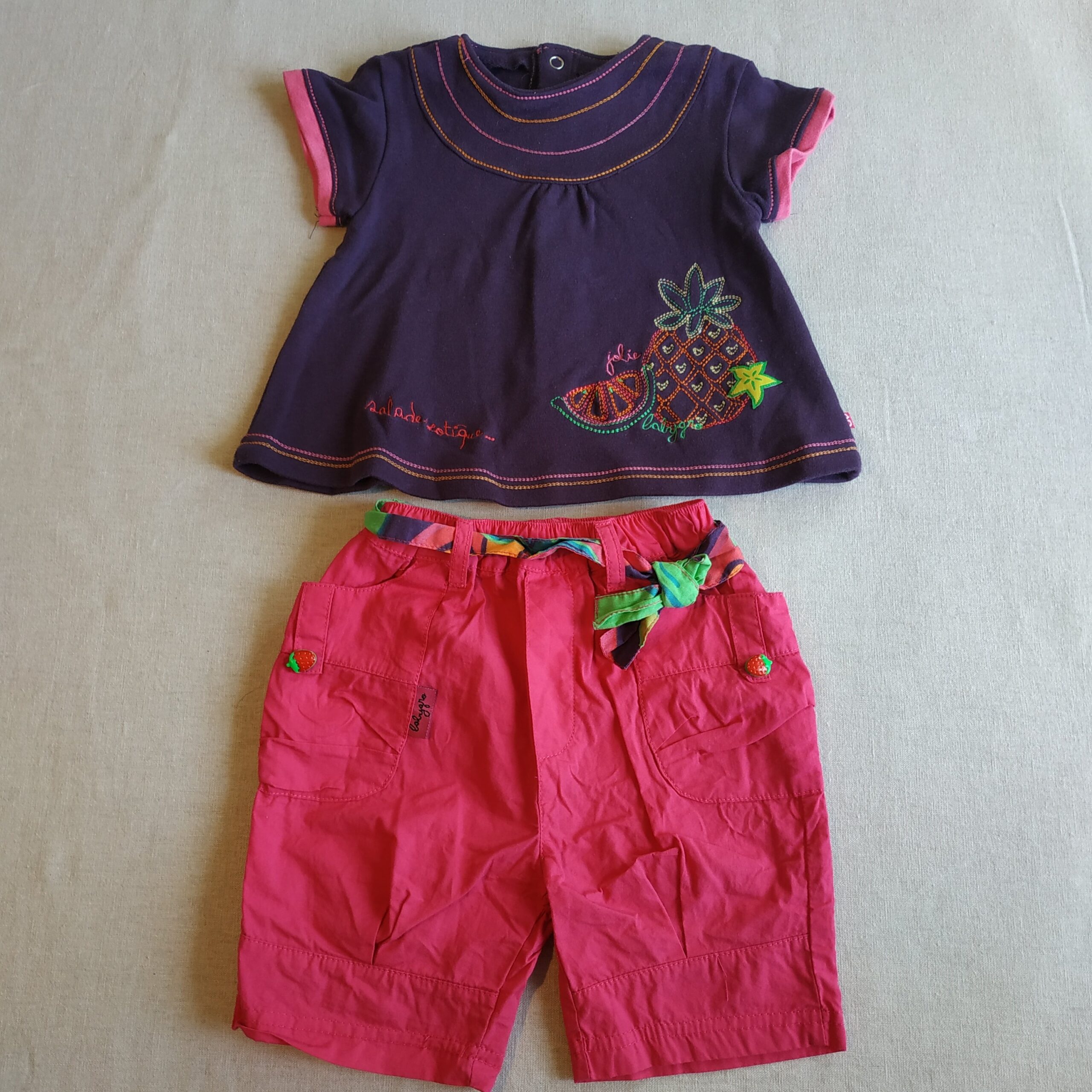 Autres commentaires : Tunique à manches courtes violette, thème salade exotique, motif brodé ananas et orange rose et orangé. Pantalon assorti rose avec ceinture à motifs exotiques intégré, taille élastiquée, deux poches sur les côtés avec des fraises cousues.