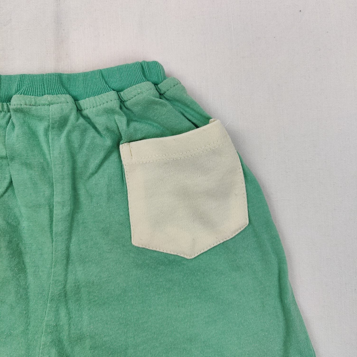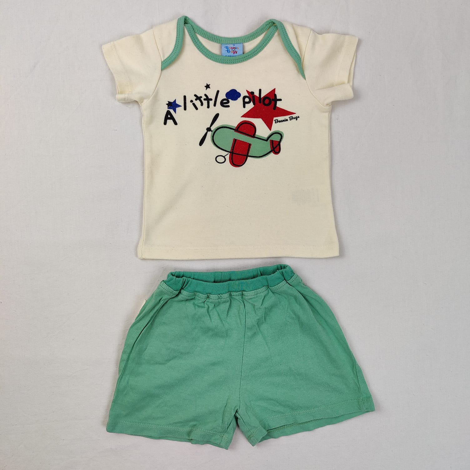 Autres commentaires : Ensemble t-shirt jaune manche court légèrement usé, imprimé « A little pilot » et short vert poche arrière jaune, peut fair office de pyjama