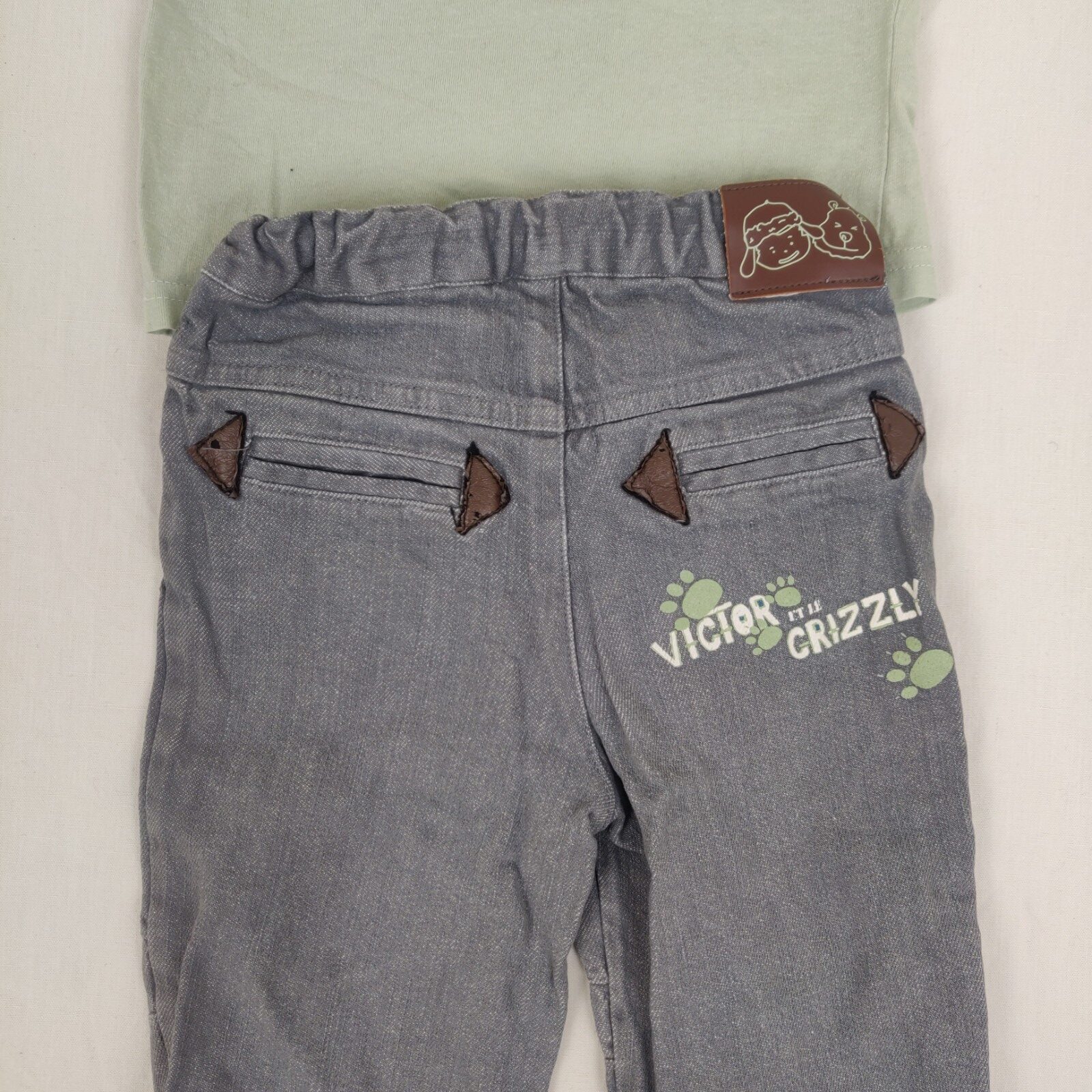 Autres commentaires : T-shirt vert manches longues avec motif Victor et le Crizzly et fermé par boutons pressions au dos. Jean gris avec poches antérieures et éxtérieures et taille élastiquée.