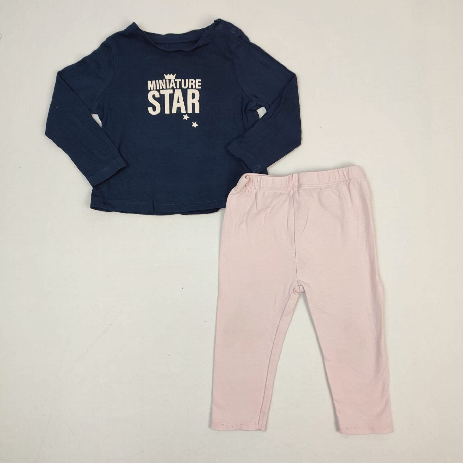 Autres commentaires : Ensemble 2 pièces : – T-shirt manches longues bleu marine Boîte à Malices, col rond, inscriptiondevant « Miniature Star », fermeture par boutons pression à l’épaule gauche, 100% coton. – Legging rose très pâle Vertboudet, taille élastiquée, 96% coton et 4% elasthanne.