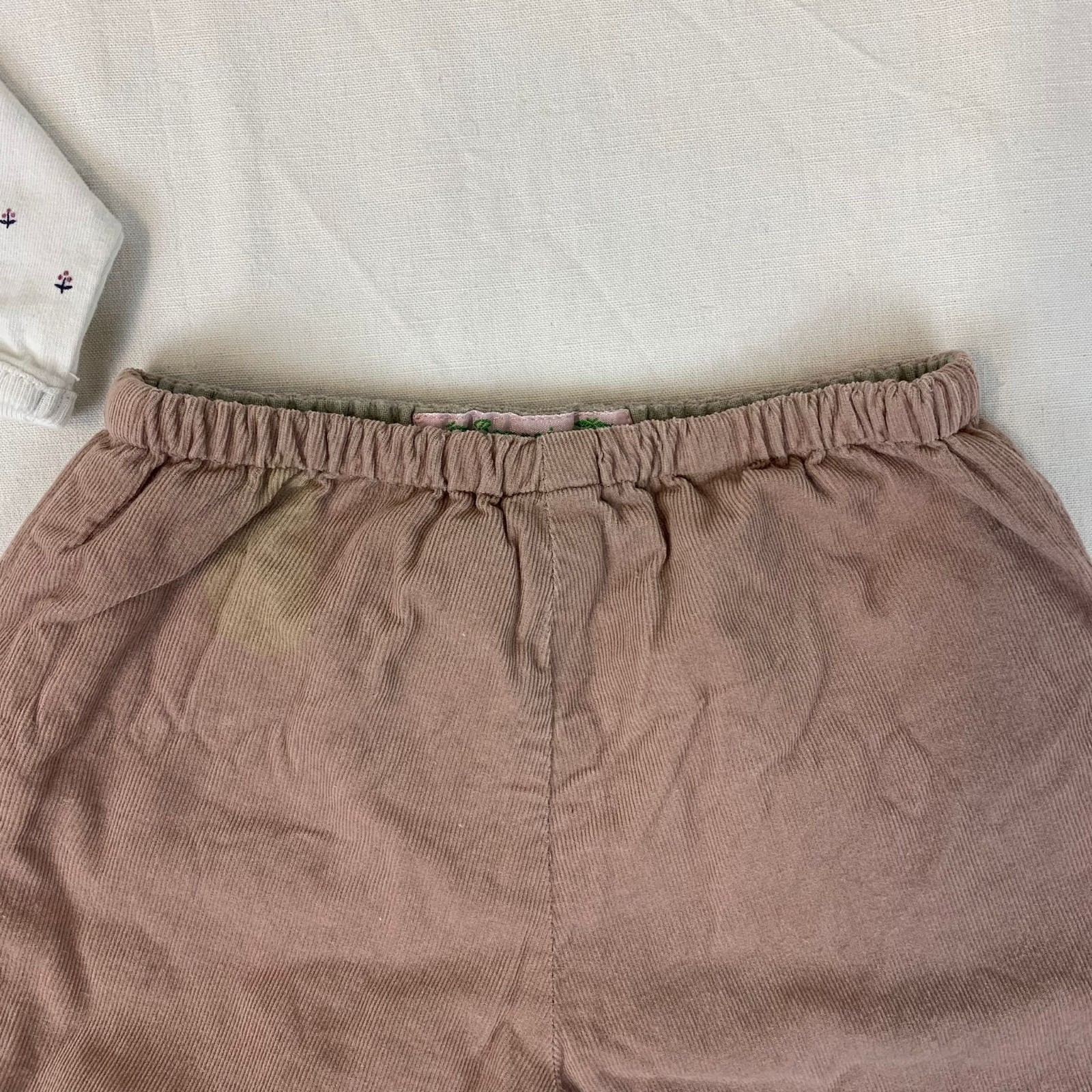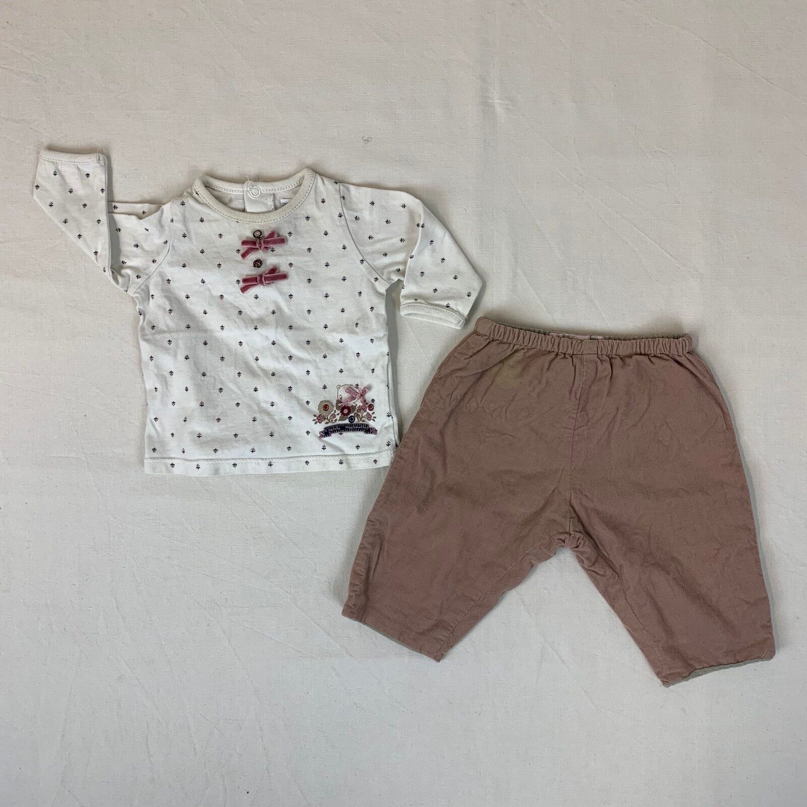 Autres commentaires : T-shirt blanc manches longues avec des points col rond, une fermeture au dos et col taché légerement. Pantalon marron avec taille élastiquée tachée sur la taille.