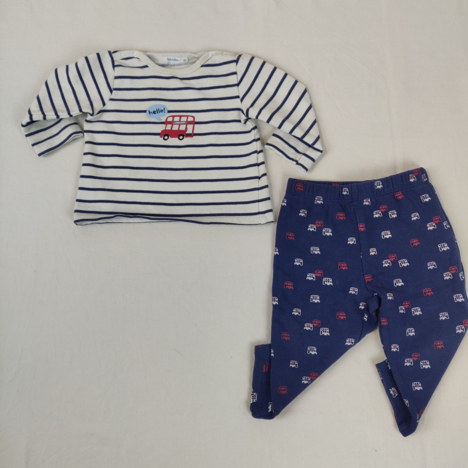 Autres commentaires : 16% polyester. Ensemble 2 pièces. Un sweat blanc rayé bleu marine. Motif central bus anglais accompagné de l’inscription « Hello ». Ouvertures latérales à 2 pressions. Usure normale. Un pantalon de jogging – bleu marine avec motifs bus anglais rouges et blancs. Taille élastique.