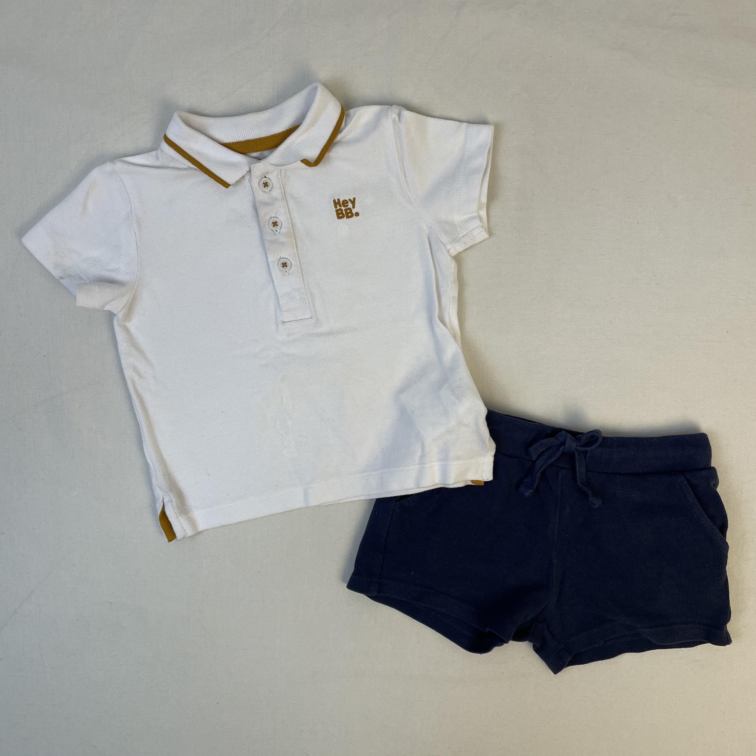 - Polo blanc, col polo, fermeture par boutons classiques, devant inscription » Hey BB », taches blanches.