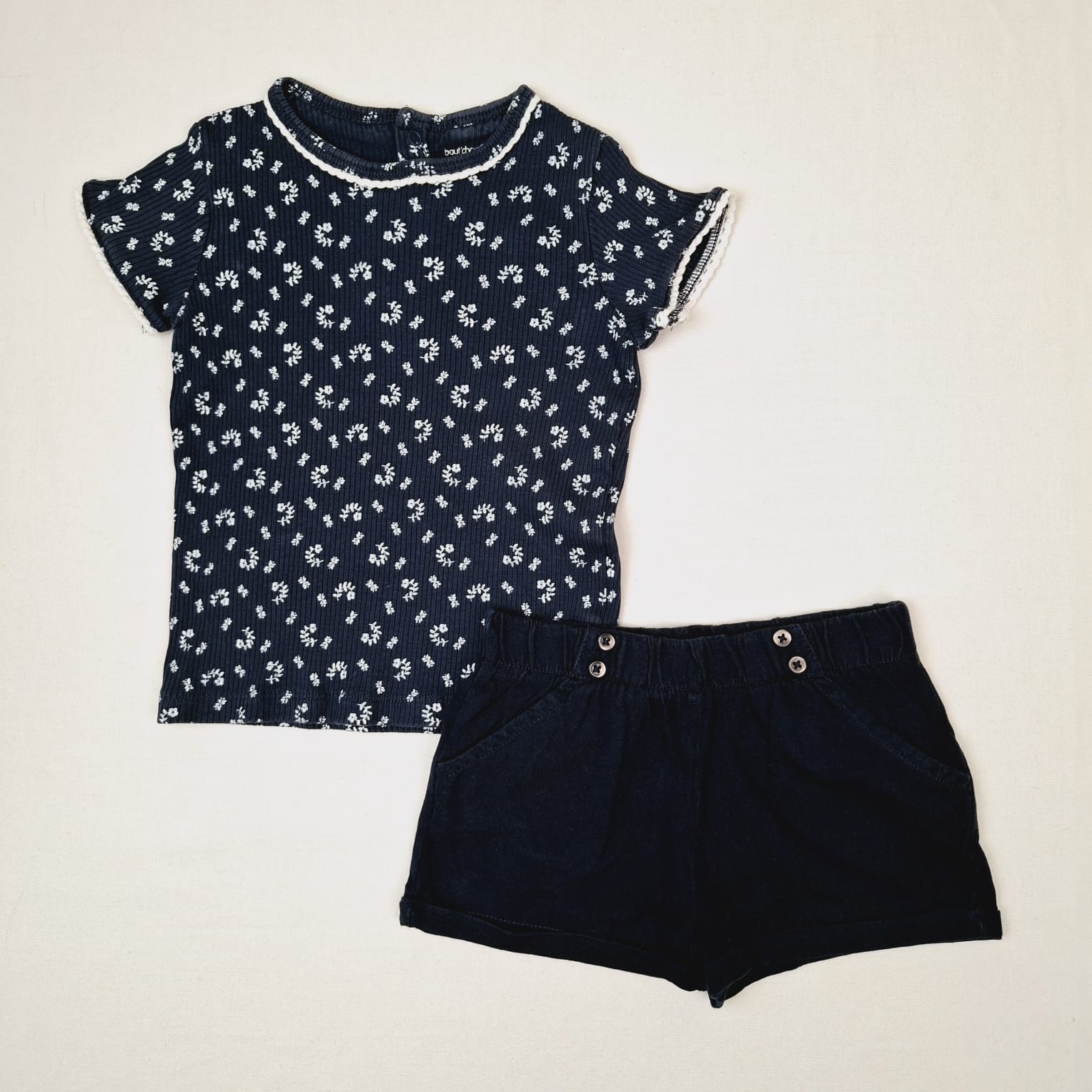 Autres commentaires : Ensemble 2 pièces bleu foncé : – T-shirt à manches courtes côtelé, motif floral blanc cassé, col rond et manches avec liseré en dentelle blanc cassé, fermeture par boutons pression en haut du dos, gamme Bio. – Short uni bleu marine, taille élastiquée, boutons décoratifs à la ceinture, revers au niveau des cuisses.
