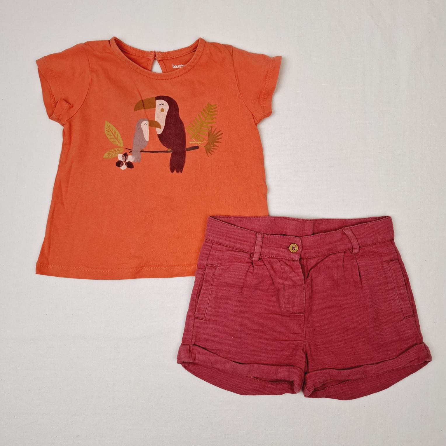 Autres commentaires : Ensemble 2 pièces : – T-shirt à manches très courtes orange, motif central toucans sur une branche, col rond, fermeture par 1 petit bouton en haut du dos. – Short bordeaux, ceinture ajustable par élastique intérieur, fermeture devant par bouton, revers au niveau des cuisses. Taille réestimée : Grand 18M ou petit 2A.