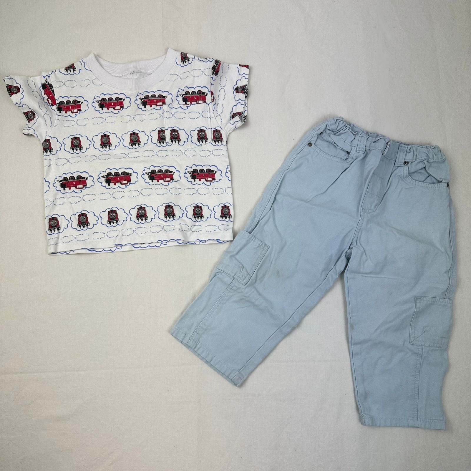 Autres commentaires : T-shirt manches courtes blanc avec motif Thomas the tank engine. Pantalon bleu clair Bout’chou avec taille ajustable. Petit défaut: tâches marron à l’arrière bas de la jambe gauche. Niveau réduit de Fraise à myrtille.