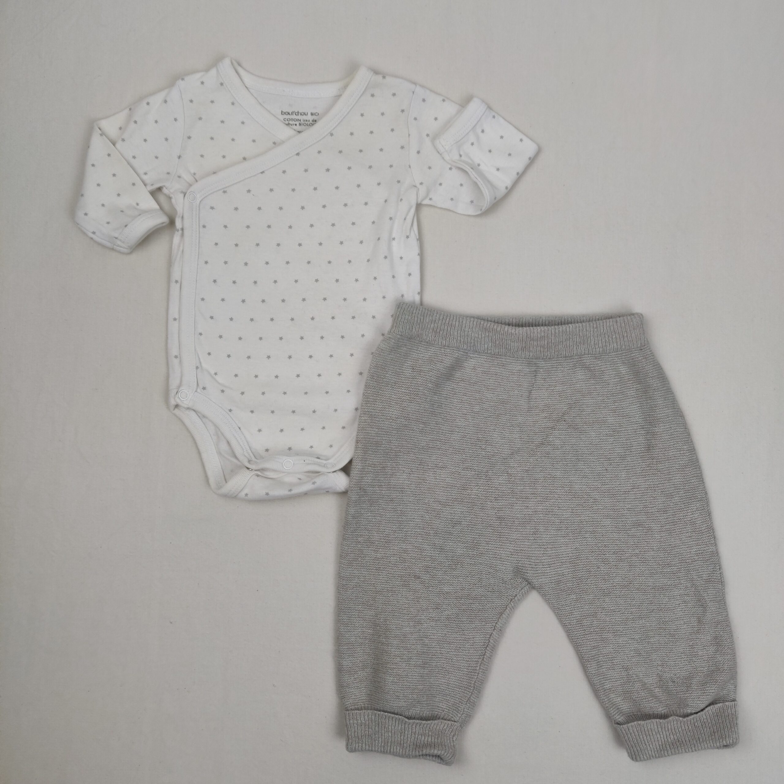 Autres commentaires : Body manches longues, col cache coeur, motif petites étoiles, fermeture par boutons pression à l’avant, pantalon gris en maille.