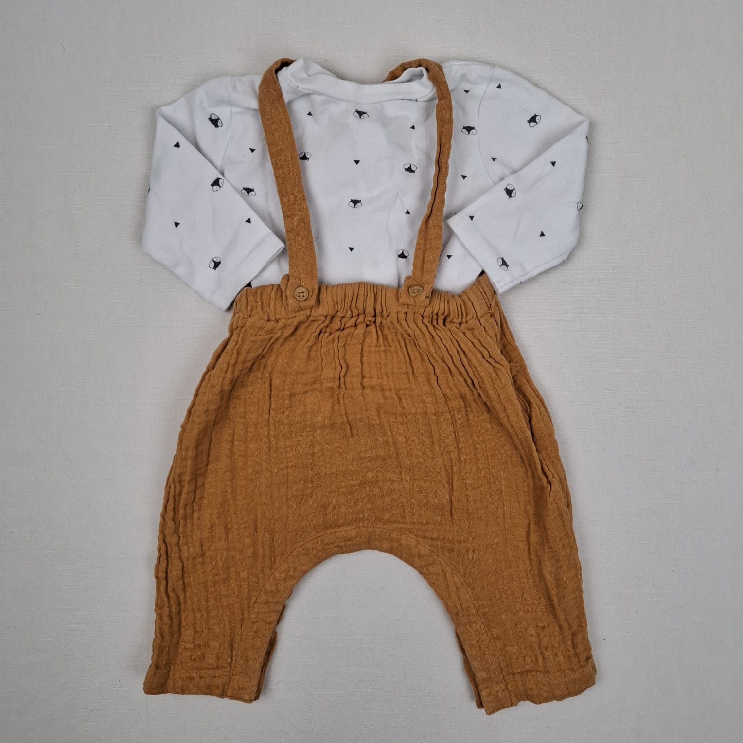 Autres commentaires : Ensemble de 2 pièce: – T-shirt blanc manches longues, à motifs de tête de renards sur tout le vêtement, col rond. – Salopette marron, bout’chou, attache des brettelles avec boutons,
