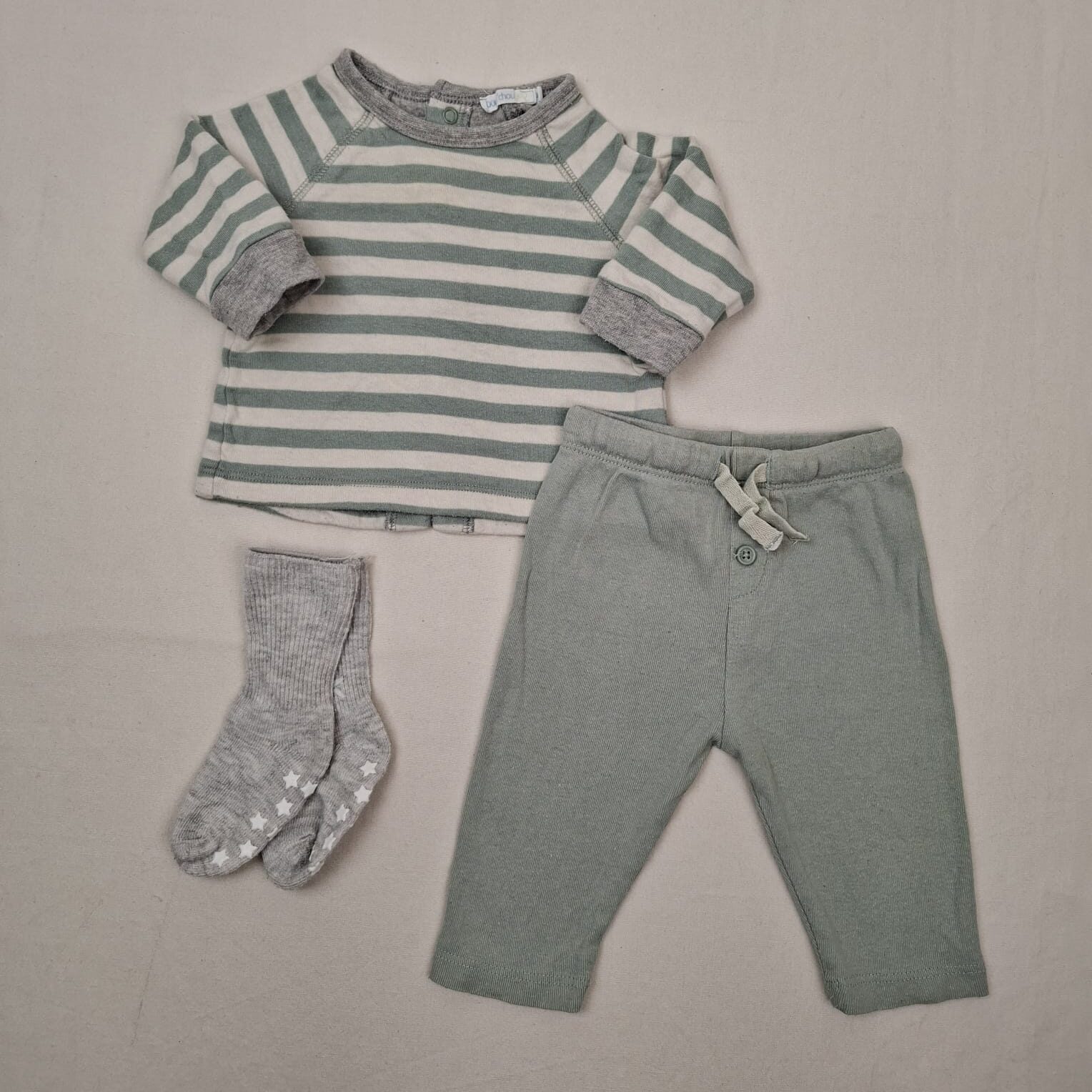 Autres commentaires : Ensembles 2 pièces : -Sweat-tshirt fin style brassières rayéés crème et vert à manche longues, fermeture par boutons pression au dos. Pantalon vert, taille élastique avec corde et deux boutons décoratifs. chaussettes offertes.