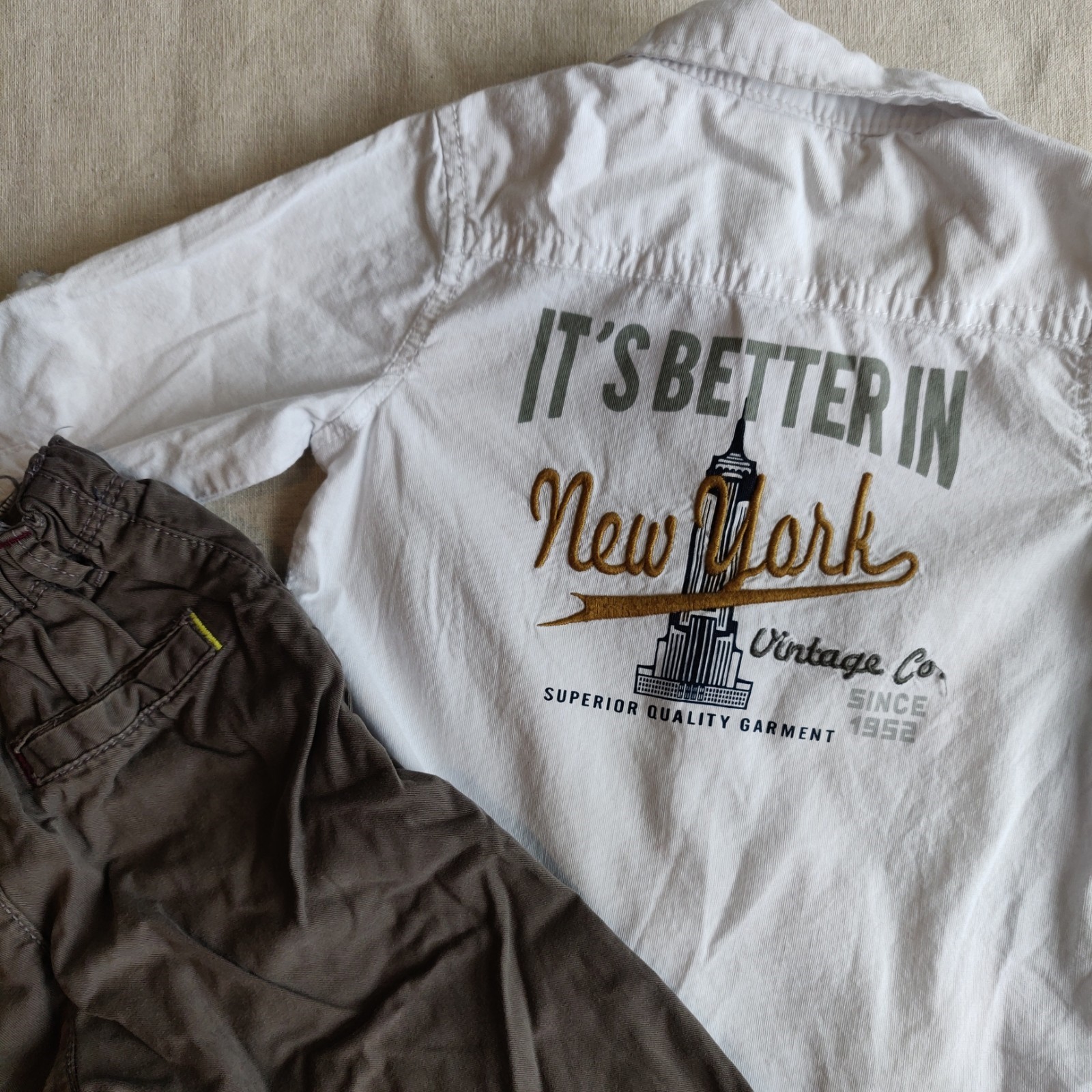 Autres commentaires : Pantalon taupe, ceinture ajustable, bouton à la taille. Doublure jersey et revers pantalon à rayures bleu ciel. Thème NYCFun Time. Chemise manches longues blanche, manches retroussables, inscription au dos « It’s better in New York ».