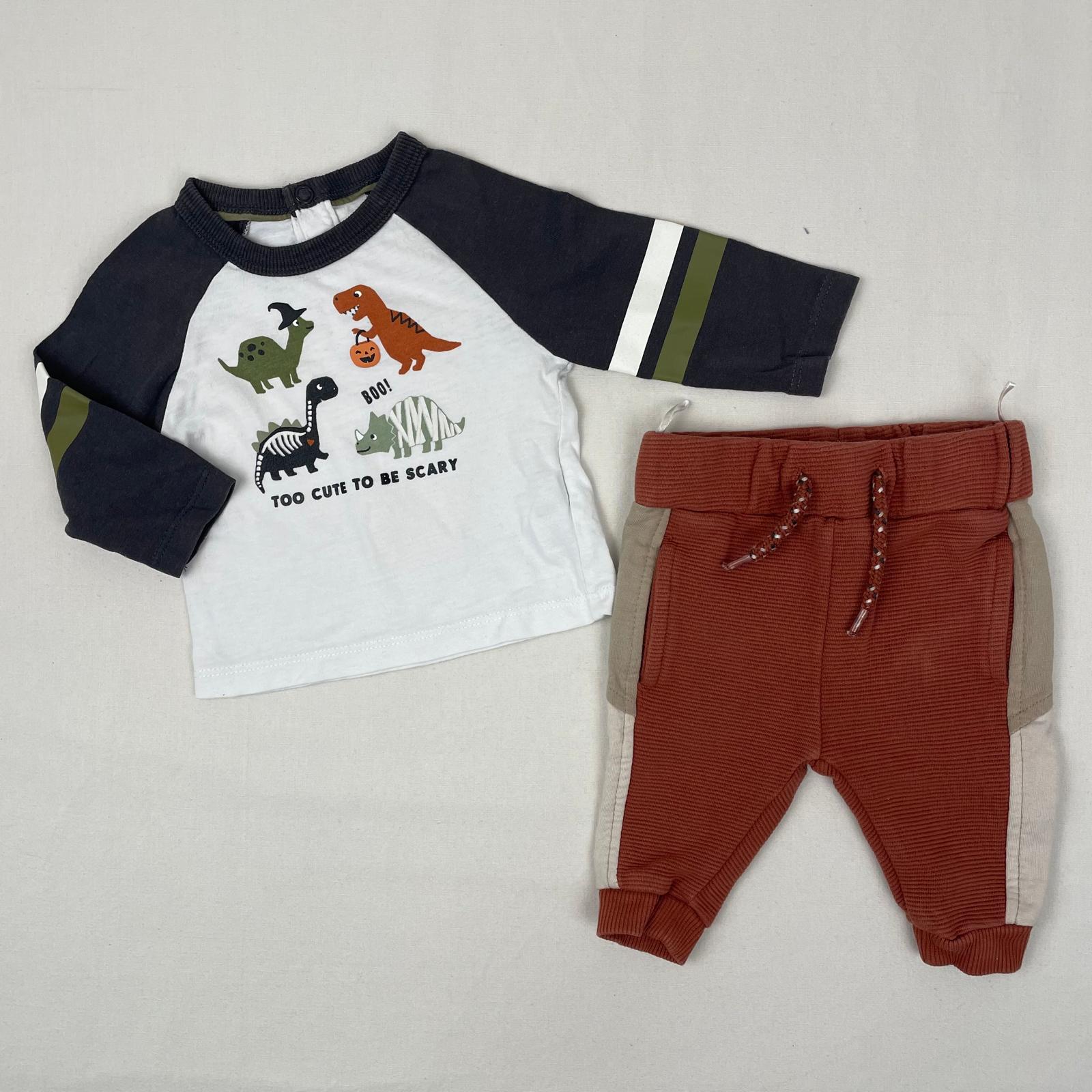 Autres commentaires : Ensemble 2 pièces; – T-shirt manches longues en blanc et gris foncé, fermeture par boutons pression au dos, devant motif dinosaures et inscription « Boo! Too cute to be scary »; – Pantalon en marron clair, taille élastique avec laçage, poignets élastiques au bas, rayures grises sur les côtés et les poches.