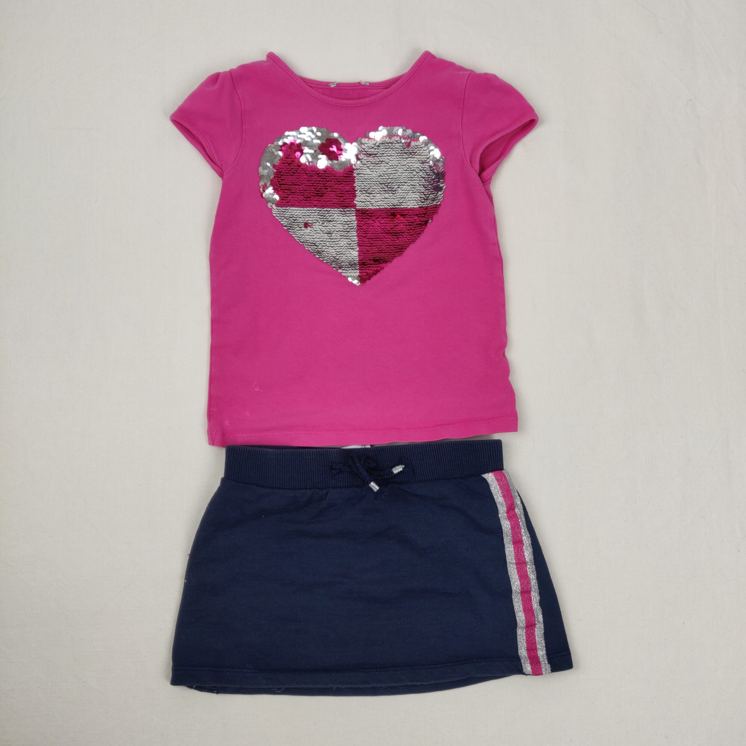 Autres commentaires : T-shirt sans marque (probablement Okaïdi) rose avec motif coeur en sequins et jupe bleu marine C&A, ceinture élstiquée, et bandes latérales argentées et roses.