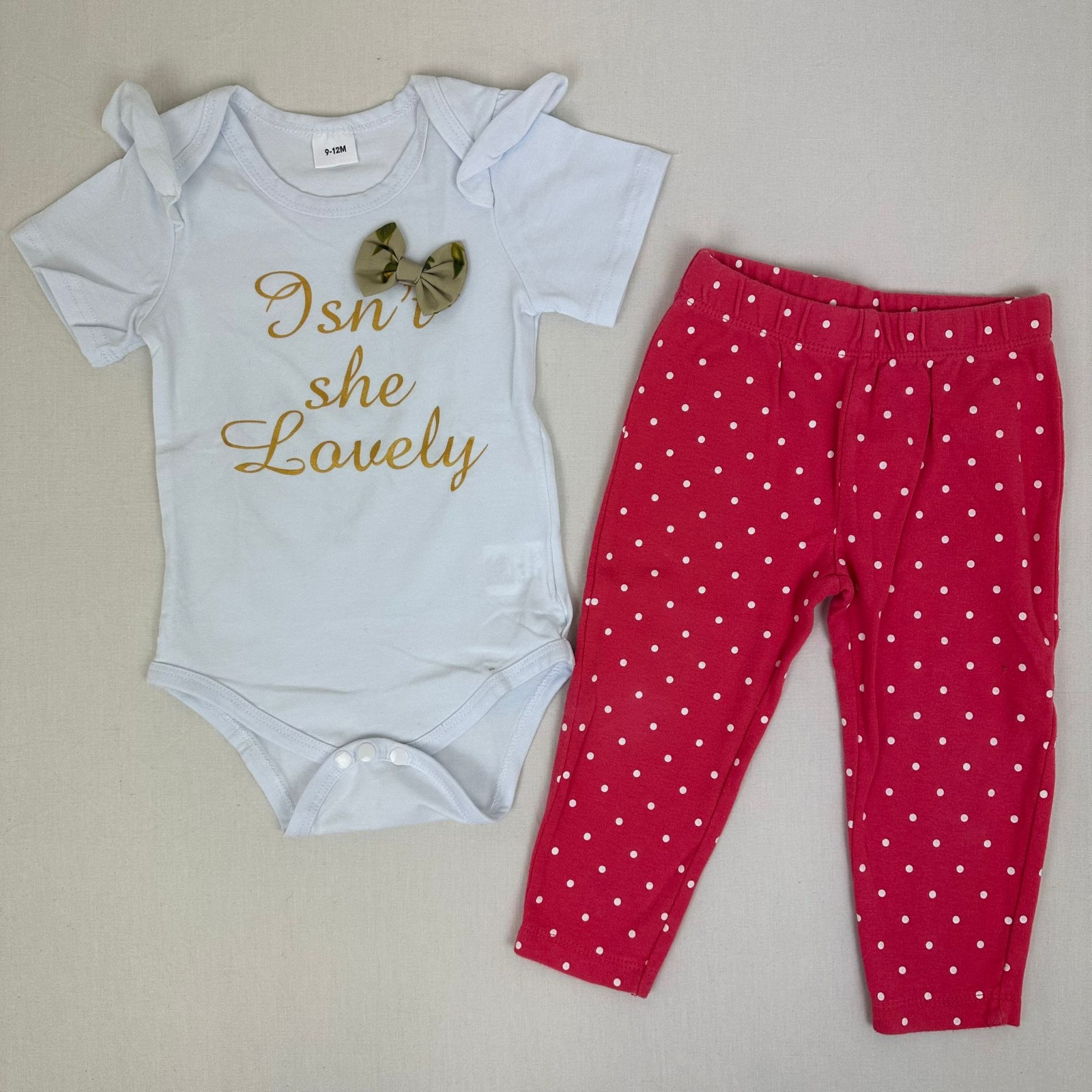 Autres commentaires : 5% Spandex. Body blanc sans marque, manches courtes avec motif ‘isn’t she lovely’. Pantalon Legging Carter’s rose avec points blanc et taille élastiquée.Petit défaut: petite tâche marron sur le body.