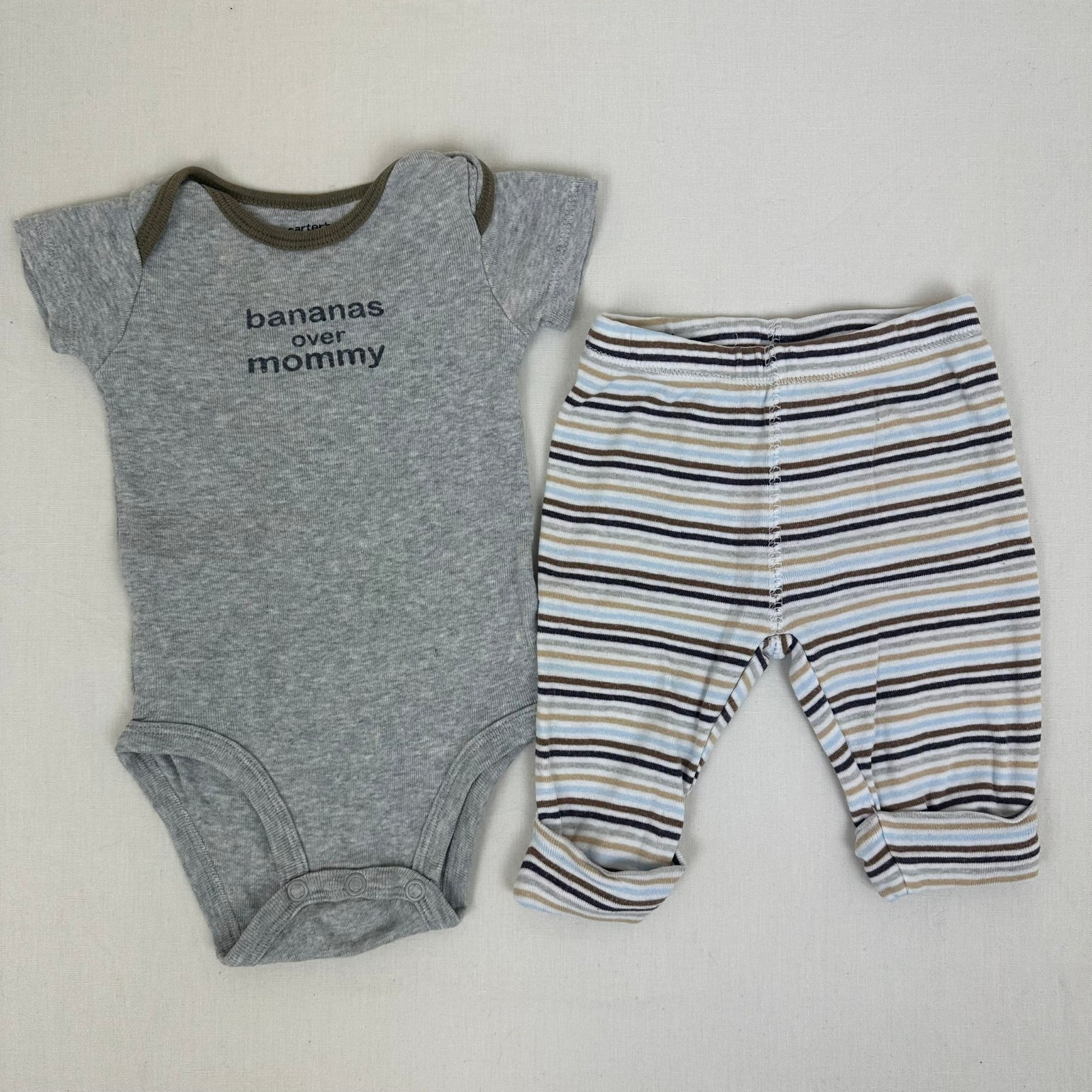 Autres commentaires : Body gris manches courtes et motif « bananas over mommy ». Legging à rayures marron, violet, gris et blanc, et taille élastiquée.